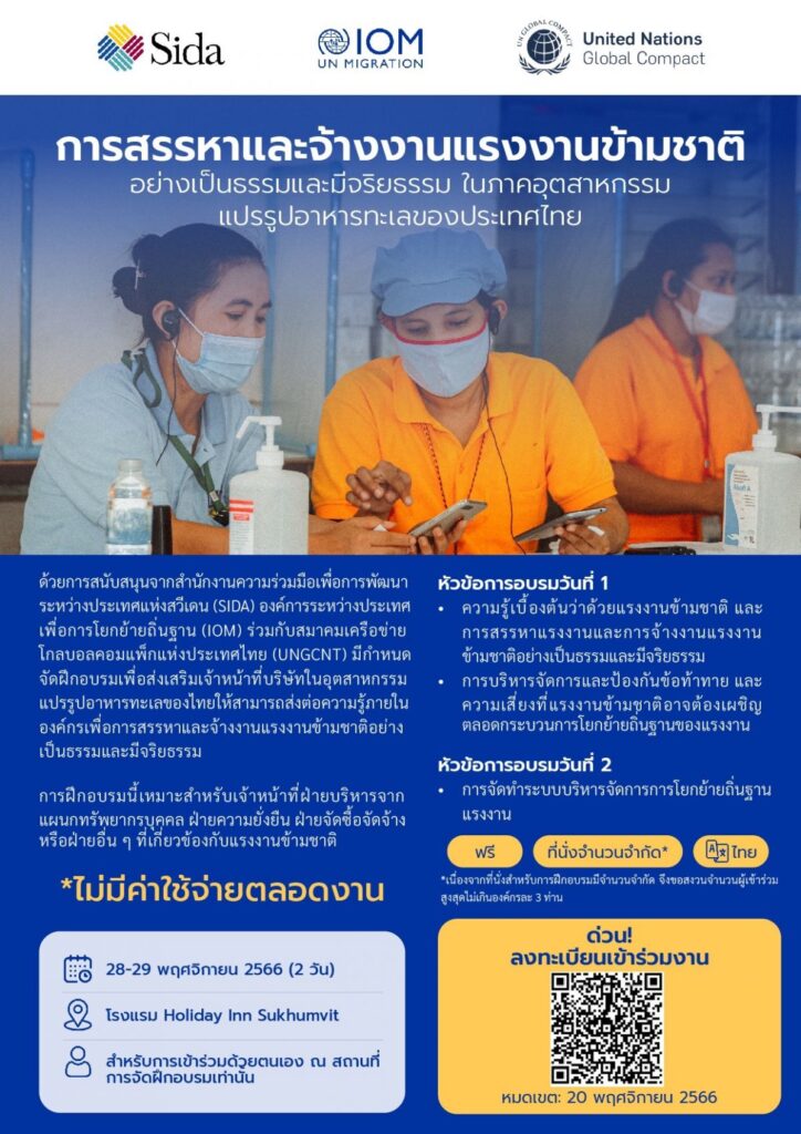 ตลอดการอบรมระหว่างวันที่ 28-29 พฤศจิกายน 2566 ณ โรงแรม Holiday Inn Sukhumvit เราได้ชี้แนะแนวทางที่ธุรกิจสามารถทำได้เพื่อส่งเสริมสิทธิของแรงงานข้ามชาติตลอดเส้นทางการย้ายถิ่นของแรงงาน เพื่อพั