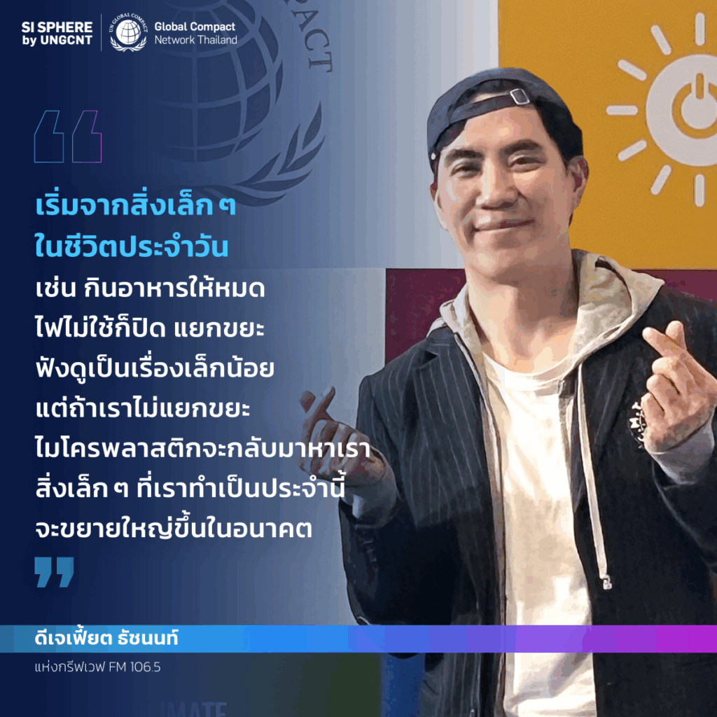 ดีเจเฟี้ยต-ธัชนนท์ จารุพัชนี ดีเจจากคลื่นกรีนเวฟ FM 106.5 เชื่อมั่นว่าการใช้ชีวิตประจำวันของเราสามารถสร้างการเปลี่ยนแปลงและช่วยโลกได้ เพราะทุกการกระทำของเราล้วนส่งผลต่อโลกใบนี้ ไม่มากก็น้อย โดยได้มาแบ่งปันประสบการณ์การดูแลสิ่งแวดล้อมและใช้ทรัพยากรอย่างรู้คุณค่าในฐานะผู้บริโภคคนหนึ่ง บนเวที #UNGCNT นิทรรศการ “THE GLOBE VENGERs” #ฮีโร่พิทักษ์ความยั่งยืน งานมหกรรมวิทยาศาสตร์และเทคโนโลยีแห่งชาติ เพื่อจุดประกายการบริโภคอย่างยั่งยืนให้กับเด็กๆ เยาวชน และคนรุ่นใหม่