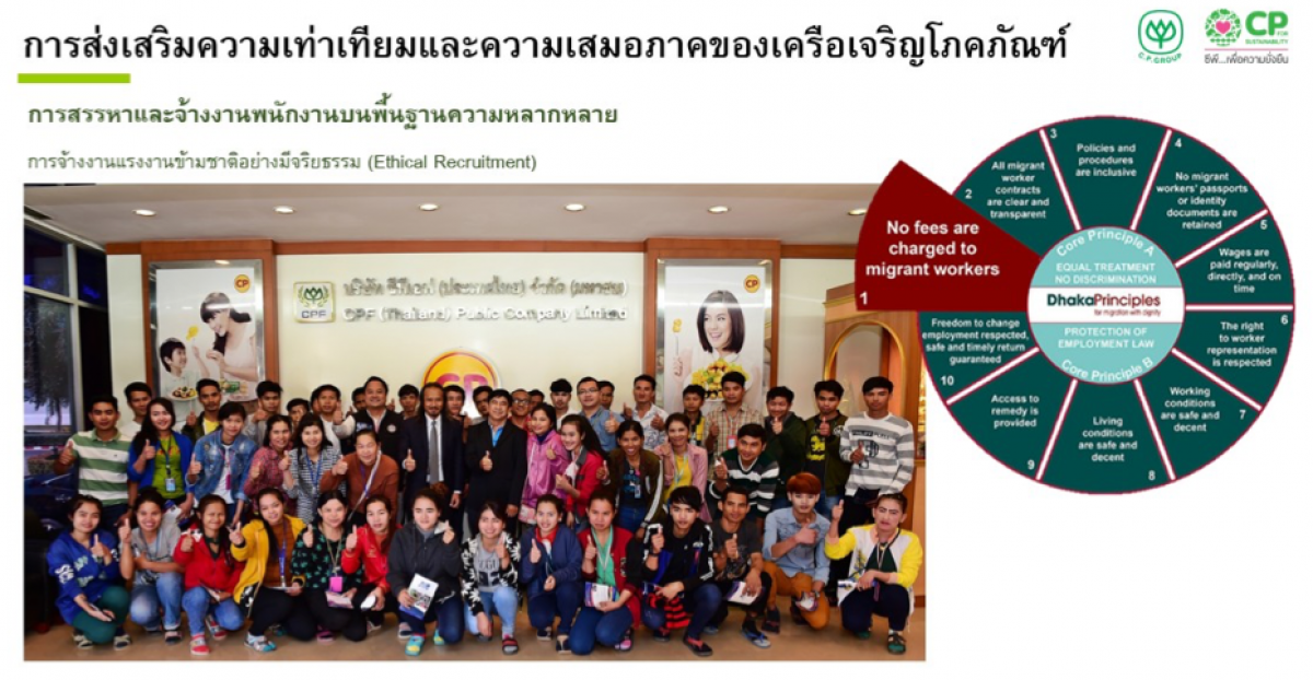 “มีการพัฒนาหลักสูตรอบรม เพื่อสร้างความเข้าใจแก่บริษัทจัดหาแรงงานข้ามชาติจากประเทศต่างๆ ว่ากระบวนสรรหาและคัดเลือกคนทำงานที่เป็นธรรมและเปิดเผยนั้นเป็นอย่างไร โดยเฉพาะการจัดหาบุคคลมาทำงานเครือเจริญโภคภัณฑ์ ที่เราเข้มงวดมากว่ากระบวนการทั้งหมดต้องโปร่งใส เพื่อป้องกันไม่ให้เกิดการใช้แรงงานบังคับในทุกรูปแบบ ไม่ว่าจะเป็นแรงงานเด็กหรือการใช้แรงงานข้ามชาติอย่างผิดกฎหมาย รวมถึงการหลอกขอเงินค่าธรรมเนียมใดๆ จากผู้ที่จะมาทำงาน” คุณแนทเล่า
