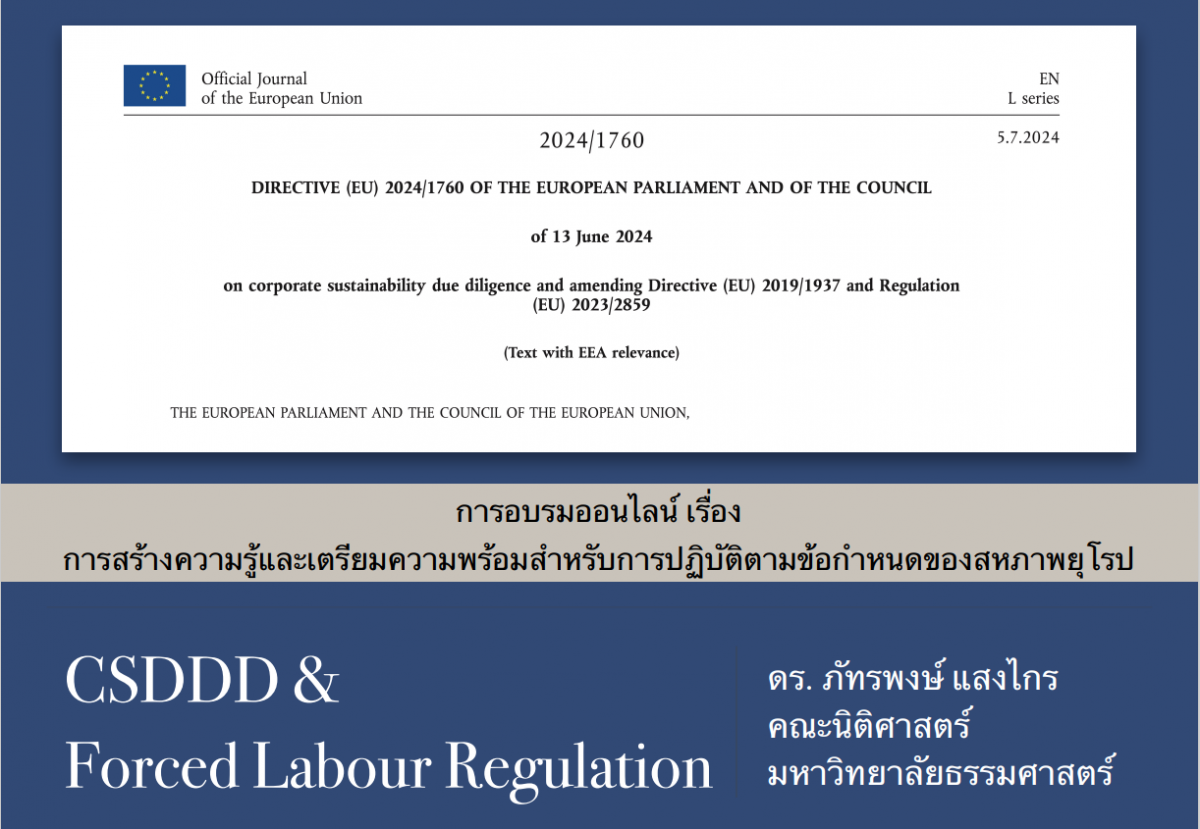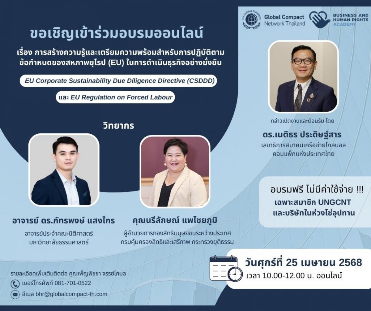 สมาคมเครือข่ายโกลบอลคอมแพ็กแห่งประเทศไทย (GCNT) ภายใต้ ฺBHR Academy จัดอบรมออนไลน์เรื่อง “การสร้างความรู้และเตรียมความพร้อมสำหรับปฏิบัติตามข้อกำหนดของสหภาพยุโรป (EU) ในการดำเนินธุรกิจอย่างยั่งยืน (EU Corporate Sustainability Due Diligence Directive (CSDDD) และ EU Regulation on Forced Labour)”