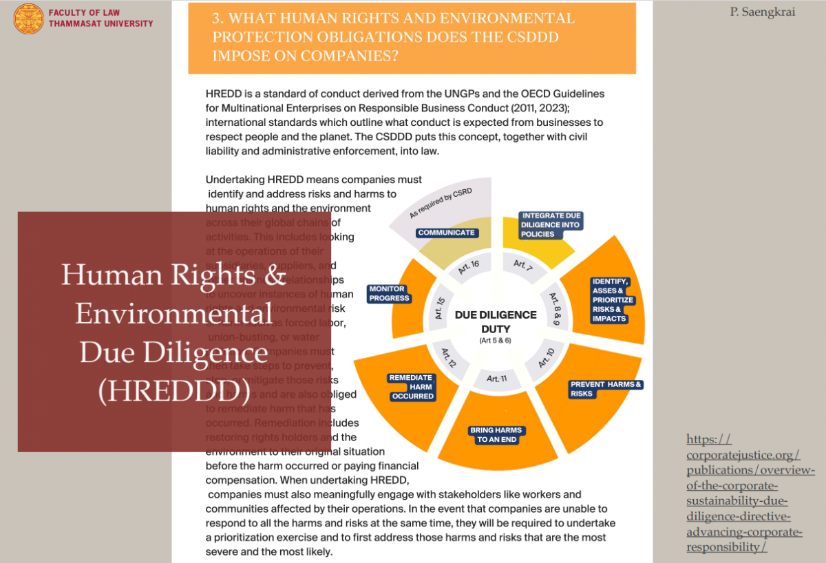 อาจารย์ ดร.ภัทรพงษ์ แสงไกร กล่าวถึงความสำคัญของ EUCSDDD มีผลกระทบต่อบริษัทไทยเพราะเป็นส่วนหนึ่งของห่วงโซ่อุปทานของบริษัทใน EU ที่อยู่ในขอบเขตของ CSDDD บริษัทเหล่านี้ต้องปฏิบัติตามมาตรฐานด้านสิทธิมนุษยชนและสิ่งแวดล้อมที่เข้มงวดขึ้น รวมถึงการให้ข้อมูลและสามารถตรวจสอบที่เกี่ยวข้องได้ โดยบริษัทไทยควรรับมือ 2 สิ่งสำคัญคือ