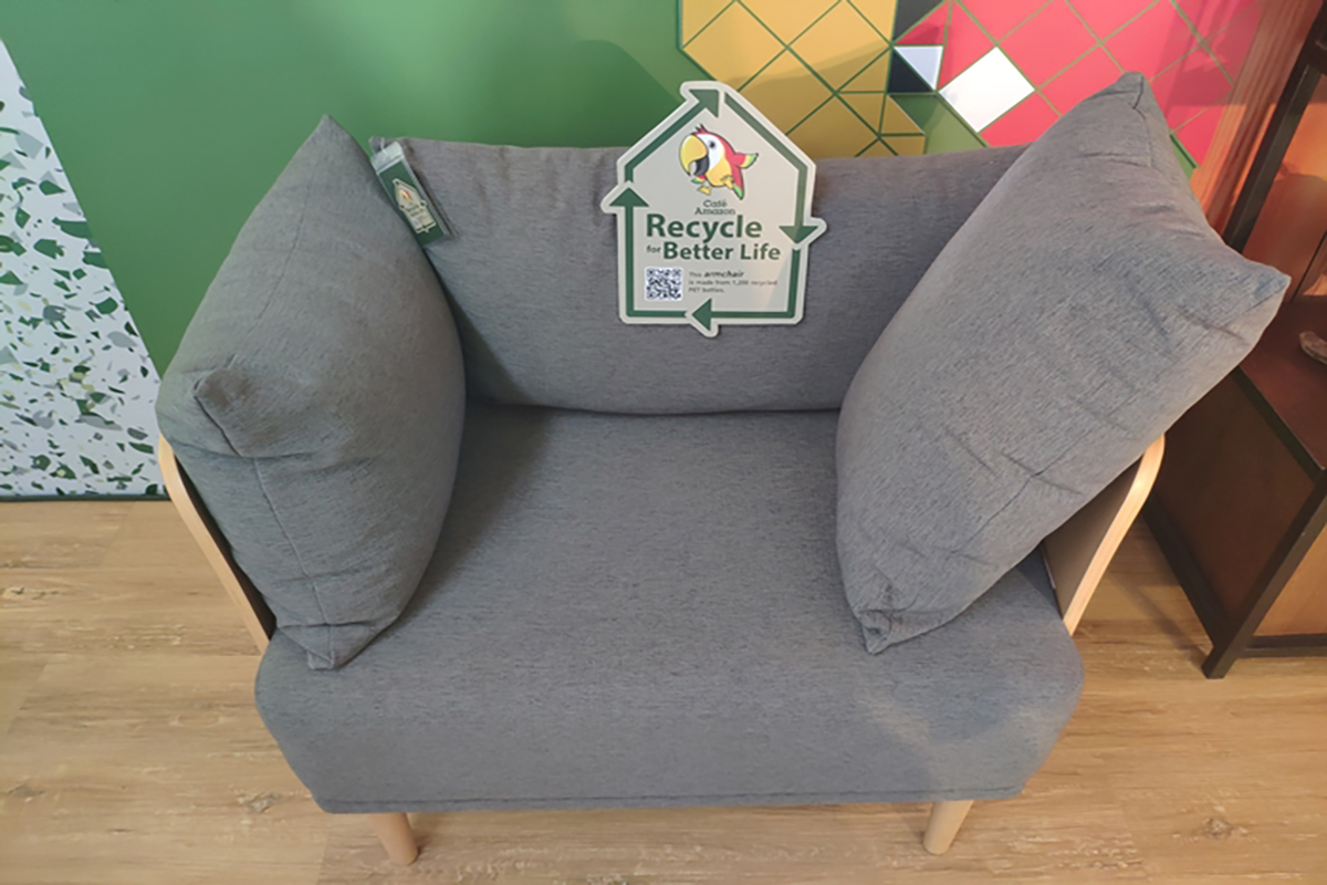 Upcycling Armchair จากขยะขวดน้ำดื่ม PET จำนวน 1,200 ขวดนำมาบด ดึงออกมาเป็นเส้นใย ทอออกมาเป็นผืนผ้า ชุดโซฟา