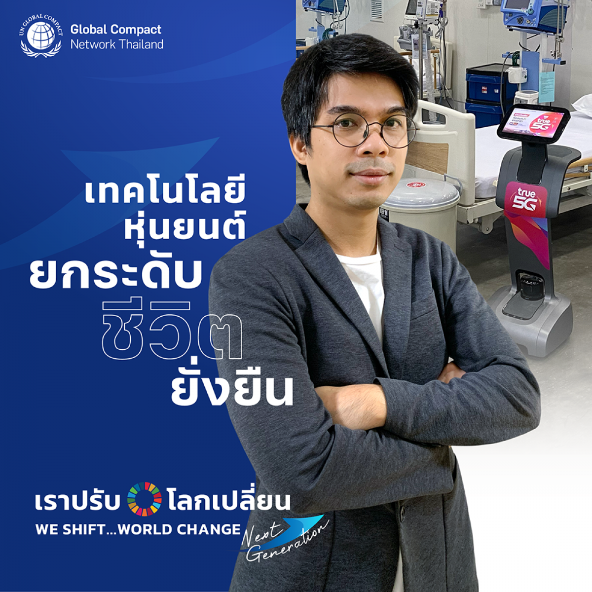 เราชวนคุณไปทำความรู้จัก True Robotics ทีมนวัตกรชาวไทย ผู้ขับเคลื่อนเทคโนโลยีหุ่นยนต์ ภายใต้บริษัท True Corporation โดยมี ดร.ธีระพล ถนอมศักดิ์ยุทธ หัวหน้าคณะผู้บริหารด้านนวัตกรรมและความยั่งยืน ที่มีวิสัยทัศน์ในการสร้างสรรค์นวัตกรรมมาตอบโจทย์โลกในอนาคต ต้องมองหาเทรนด์หรือเทคโนโลยีใหม่ ๆ ที่กำลังเข้ามาดิสรัปธุรกิจเดิม และให้สอดรับกับทิศทางของกลุ่มทรูที่กำลังปรับตัวสู่การเป็น “เทคคัมพานี” เป็นองค์กรดิจิทัลอย่างสมบูรณ์แบบ ซึ่งพวกเขาไม่เพียงนำหุ่นยนต์ที่สร้างสรรค์ขึ้นไปใช้อำนวยความสะดวกแก่ผู้คนเท่านั้น แต่ยังนำไปใช้ผลักดันความยั่งยืนให้สังคมในมิติต่างๆ โดยเฉพาะช่วงการแพร่ระบาดของโควิด–19 ที่ผ่านมา เจ้าหุ่นยนต์ได้เข้าไปมีบทบาทสำคัญในโรงพยาบาลหลายแห่งทั่วประเทศ