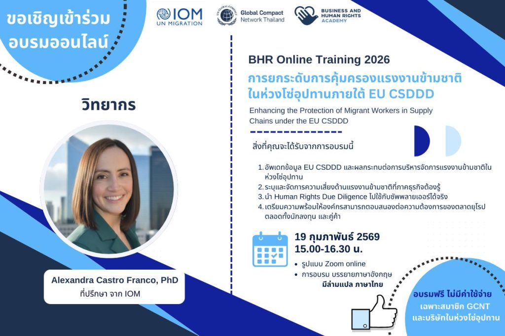 GCNT ร่วมกับองค์การระหว่างประเทศเพื่อการโยกย้ายถิ่นฐาน (IOM) จัดสัมมนาออนไลน์ในหัวข้อ การยกระดับการคุ้มครองแรงงานข้ามชาติในห่วงโซ่อุปทานภายใต้ EU CSDDD “Enhancing the Protection of Migrant Workers in Supply Chains under the EU CSDDD” เพื่อยกระดับความรู้และความเข้าใจด้าน EU CSDDD หรือกฎระเบียบว่าด้วยการตรวจสอบการดำเนินธุรกิจอย่างยั่งยืนขององค์กร บรรยายโดยวิทยากรผู้เชี่ยวชาญ คุณ Alexandra Castro Franco ที่ปรึกษาจากองค์การระหว่างประเทศเพื่อการโยกย้ายถิ่นฐาน