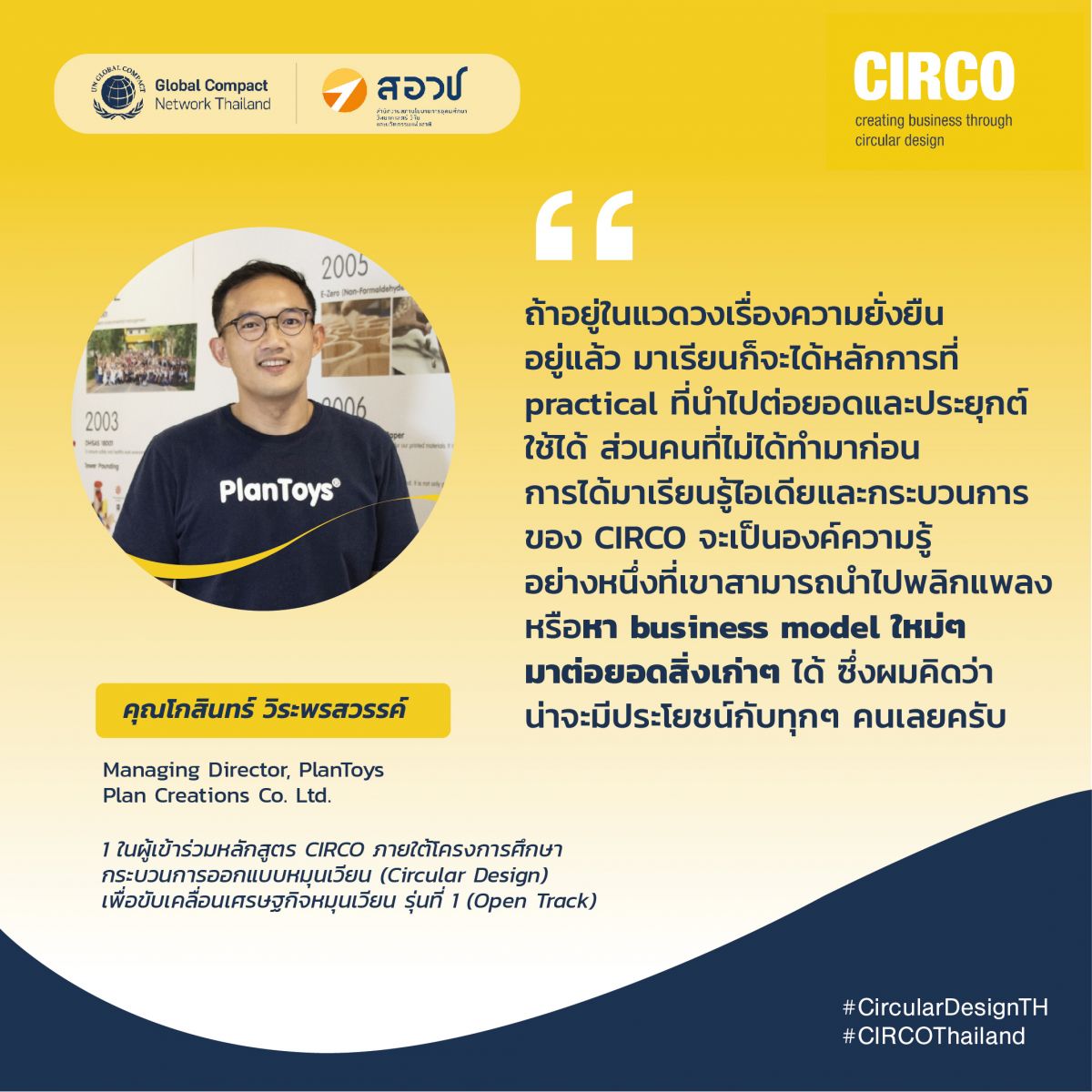 ตอนนี้เรา (PlanToys) กำลังจะทำ sustainability roadmap ครับ พิลลาร์หนึ่งที่เราพูดถึงก็คือ ‘way of working/way of practice’ ว่าน่าจะเอาเรื่องของCircular Economy เข้ามาใช้นะ แล้วก็ประจวบเหมาะกับที่ CIRCO ได้โปรโมทเรื่องนี้อยู่พอดี เราก็เลยคิดว่าเราลองมาหาความรู้ดีกว่า เพราะจริง ๆ แล้วเราก็ทำเรื่องของการพัฒนาอย่างยั่งยืนหรือเศรษฐกิจพอเพียงอะไรแบบนี้มาเยอะแล้ว พอได้มาเจอกับ Circular Economy เลยคิดว่า อย่างน้อยมันก็เป็นโมเดลที่เราสามารถนำมาใช้ในการทำธุรกิจได้