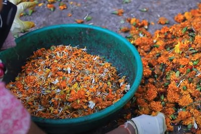 Women are creating compost from ceremonial flowers and simultaneously cleaning up the River Ganges.