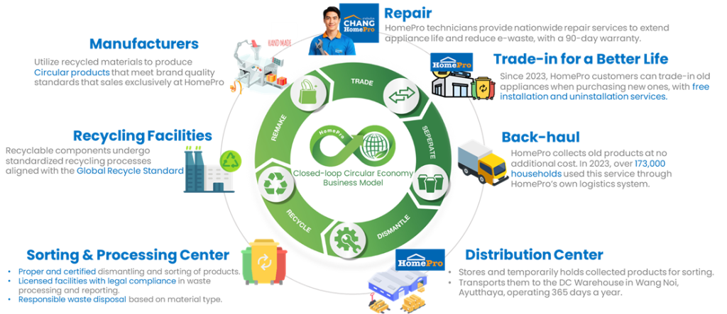 โฮมโปรใช้ประโยชน์จากโครงข่ายโลจิสติกส์และสาขาที่ครอบคลุมทั่วประเทศ มาปรับเปลี่ยนเป็นหน่วย Take-back หรือการเก็บขนส่งกลับที่มีประสิทธิภาพ เข้าไปจัดการถึงบ้านลูกค้าเพื่อแก้ Pain Point สำคัญในการขนย้ายและจัดการสินค้าขนาดใหญ่ที่ชำรุด ซึ่งมักเป็นปัญหาในการกำจัดของครัวเรือน โดยในปี 2025 โฮมโปรเก็บรวบรวมสินค้าอิเล็กทรอนิกส์มากกว่า 250,000 ชิ้น โดยคิดเป็นเครื่องใช้ไฟฟ้าขนาดใหญ่ประมาณ 80% ซึ่งโฮมโปรนำไปจัดการอย่างถูกวิธี เป็นวัสดุหมุนเวียนเป็นกลับเข้าสู่ระบบเศรษฐกิจ มากกว่า 1100 ตัน