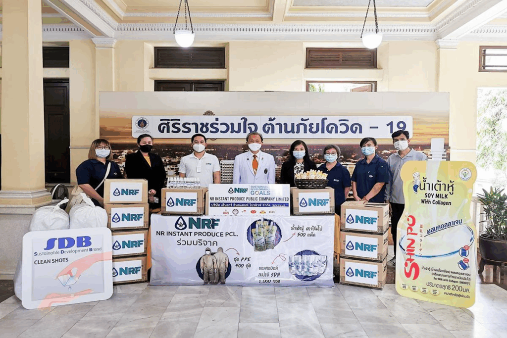 เมื่อวันที่ 28 พฤษภาคม 2563 ที่ผ่านมา บริษัท เอ็นอาร์ อินสแตนท์โปรดิวซ์ จำกัด (มหาชน) หรือ NRF นำโดย คุณแดน ปฐมวาณิชย์ ประธานเจ้าหน้าที่บริหาร (ที่ 3 จากซ้าย) ,คุณเพ็ญอุไร ไชยชัชวาล กรรมการบริหาร (ที่ 4 จากขวา), คุณชุตินธร อนันปิยภา ผู้จัดการฝ่ายความยั่งยืน (ที่ 2 จากซ้าย), คุณศิริพร โล่ห์สุรกาญจน์ ผู้จัดการฝ่ายสำนักงาน (ที่ 3 จากขวา) พร้อมพนักงานบริษัทของ NRF ขอร่วมเป็นส่วนหนึ่งในการสนับสนุนและส่งกำลังใจให้แก่บุคลากรทางการแพทย์ โรงพยาบาลศิริราช ด้วยการมอบแอลกอฮอล์สเปรย์ แบรนด์ SDB (Sustainable Development Brand) จำนวน 1,002 ชิ้น มูลค่า 9,775.67 บาท, น้ำเต้าหู้พาสเจอไรส์ แบรนด์ชินโป (Shinpo) จำนวน 500 แพค มูลค่า 6,500 บาท ซึ่งเป็นผลิตภัณฑ์ภายใต้แบรนด์ของกลุ่มบริษัท NRF และชุด PPE จำนวน 400 ชุด มูลค่า 76,000 บาท รวมมูลค่ากว่า 92,275.67 บาท โดยมี ศ.ดร.นพ.ประสิทธิ์ วัฒนาภา คณบดีคณะแพทยศาสตร์ศิริราชพยาบาล ม.มหิดล เป็นผู้รับมอบ ณ โรงพยาบาลศิริราช เพื่อร่วมขอบคุณและขอชื่นชมบุคลากรทางการแพทย์ พยาบาล เจ้าหน้าที่ทุกท่านที่ปฎิบัติงานอย่างทุ่มเทในการควบคุมและป้องกันการแพร่ระบาดของไวรัสโคโรนา