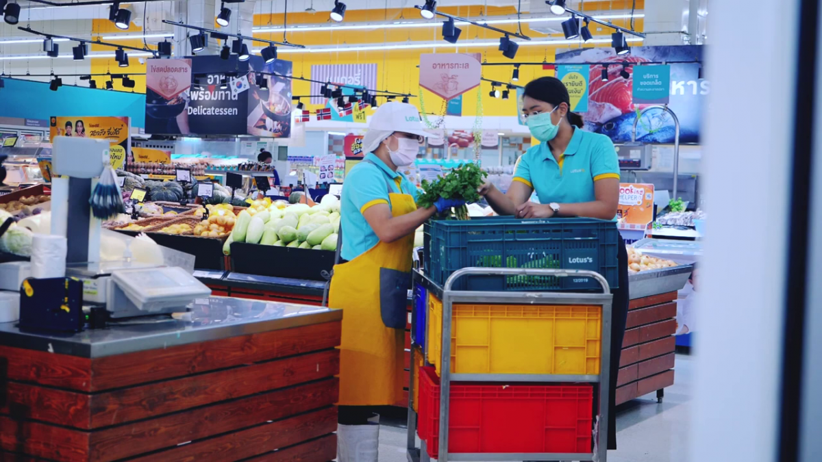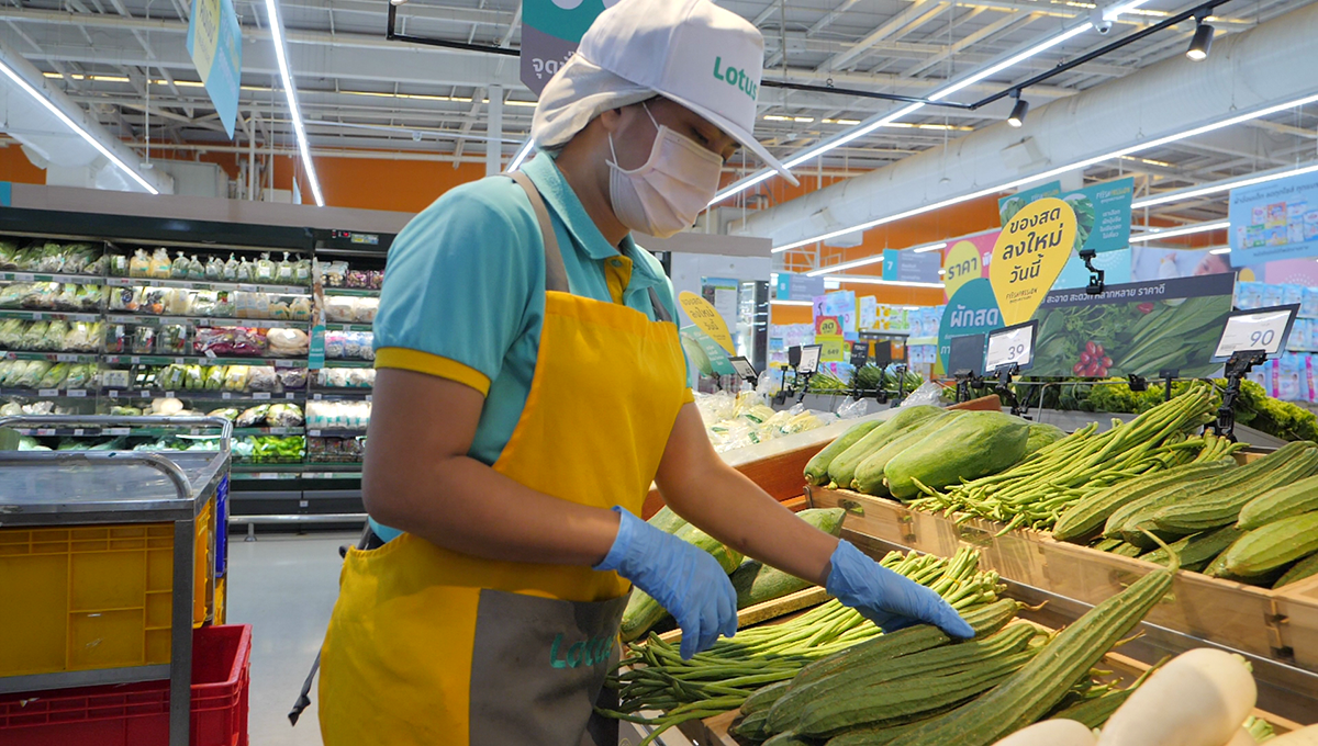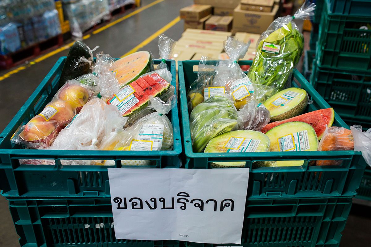 ที่โลตัส สาขารังสิตคลอง 4 เมื่อมองไปรอบๆ ก็เห็นชั้นวางวัตถุดิบเรียงรายไปด้วยผักผลไม้สดใหม่อย่างที่คุ้นเคย อย่างไรก็ตาม การดำเนินงานของโลตัสสาขานี้พิเศษกว่า ตรงที่ในแต่ละวัน พนักงานจะคัดแยกวัตถุดิบที่หมดอายุการขายออกเป็น 2 ประเภทใหญ่ๆ นั่นคือ พืชผักผลไม้ที่บริจาคให้คนและบริจาคให้สัตว์ เพื่อลดปริมาณวัตถุดิบขายไม่ได้ที่ต้องทิ้งไปยังพื้นที่ฝังกลบ