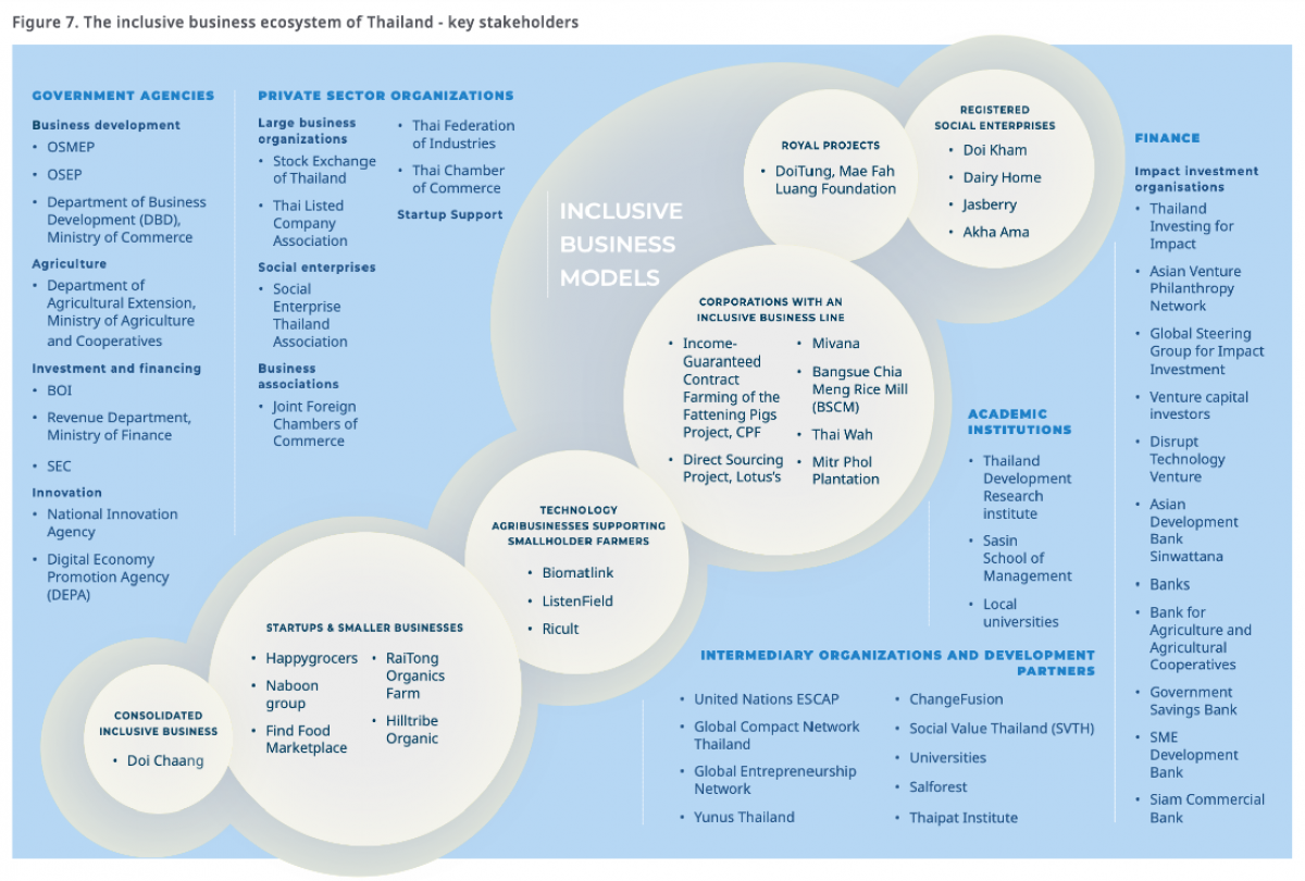 เช่น คณะกรรมาธิการเศรษฐกิจและสังคมแห่งสหประชาชาติสำหรับเอเชียและแปซิฟิก (ESCAP) ที่กำลังทำงานอย่างใกล้ชิดกับหน่วยงานภาครัฐและเอกชนสำคัญในประเทศไทย เพื่อส่งเสริมการเจรจาระหว่างภาครัฐและภาคธุรกิจ และสนับสนุนฟอรัมการลงทุน IB แห่งชาติ ทั้งยังร่วมมือกับ มูลนิธิ Bill & Melinda Gates สนับสนุนธุรกิจ IB ด้านเกษตรกรรมและระบบอาหาร และได้จัดทำรายงานศึกษาภาพรวมของโมเดลธุรกิจ IB ในอาเซียนและประเทศไทยอย่างครอบคลุม