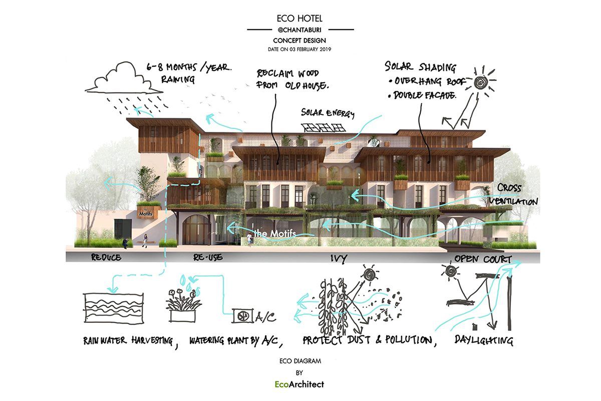 The Motifs Eco Hotel ถูกสร้างขึ้นด้วยแนวคิดเพื่อน-บ้าน-ธรรมชาติหรือ Eco-Living ให้โรงแรมหายใจร่วมกับธรรมชาติ และมอบภาวะอยู่สบายแก่แขกที่มาเข้าพัก ผ่านพื้นที่ซึ่งเชื่อมโยงธรรมชาติรอบตัว ภายในชุมชน ตลอดจนสิ่งแวดล้อมเข้าไว้ด้วยกันอย่างกลมกลืน