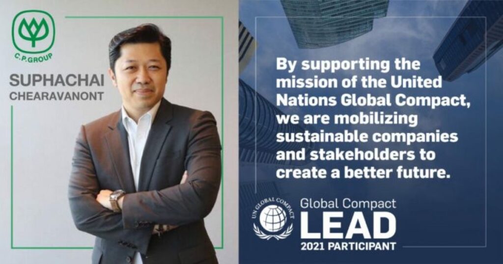 นายศุภชัย เจียรวนนท์ ประธานคณะผู้บริหาร บริษัท เครือเจริญโภคภัณฑ์ จำกัด เปิดเผยว่า ในฐานะบริษัทไทยเครือเจริญโภคภัณฑ์มีความภูมิใจที่ได้รับคัดเลือกให้เป็น Global Compact Lead จากสหประชาชาติ ตอกย้ำให้เห็นถึงความมุ่งมั่นในการประกอบธุรกิจภายใต้หลักการพัฒนาที่ยั่งยืนในทุกมิติ ทิศทางและเป้าหมายความยั่งยืนของเครือเจริญโภคภัณฑ์สู่ปี 2573 ยังมีความท้าทายที่เด่นชัดและเป็นปัญหาใหญ่ของโลกคือเรื่องของสิ่งแวดล้อมและการเปลี่ยนแปลงของสภาพภูมิอากาศ โดยเฉพาะปัญหาโลกร้อน ปัญหาเรื่องมลภาวะทั้งในอากาศ ในน้ำ และบนดิน