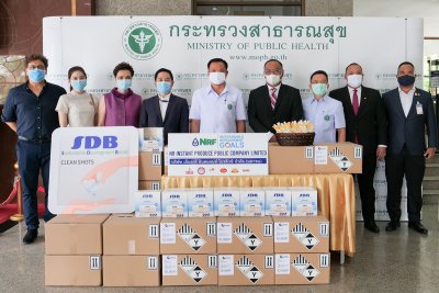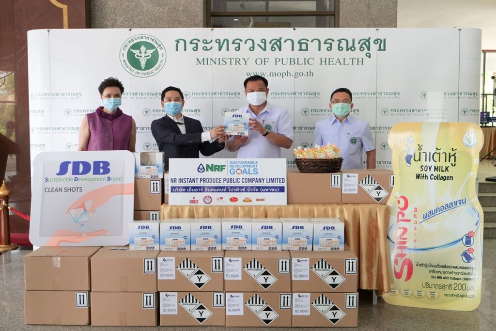 นายแดน ปฐมวาณิชย์ (ที่ 2 จากซ้าย) ประธานเจ้าหน้าที่บริหาร บริษัท เอ็นอาร์ อินสแตนท์โปรดิวซ์ จำกัด (มหาชน) หรือ NRF และนางศุภจี สุธรรมพันธุ์ (ที่ 1 จากซ้าย) ประธานเจ้าหน้าที่บริหารกลุ่ม บริษัท ดุสิตธานี จำกัด (มหาชน) และกรรมการบริษัทของ NRF ขอร่วมเป็นส่วนหนึ่งในการสนับสนุนและส่งกำลังใจให้แก่บุคลากรทางการแพทย์ ด้วยการมอบเจลแอลกอฮอล์ Hand sanitizers แบรนด์ SDB (Sustainable Development Brand) จำนวน 50,000 ชิ้น มูลค่า 250,000 บาท และน้ำเต้าหู้พาสเจอไรส์ รสคอลลาเจน แบรนด์ชินโป (Shinpo) จำนวน 1,000 แพค มูลค่า 13,000 บาท ซึ่งเป็นผลิตภัณฑ์ภายใต้แบรนด์ของกลุ่มบริษัท NRF รวมมูลค่ากว่า 263,000 บาท โดยมี นายอนุทิน ชาญวีรกุล (กลาง) รัฐมนตรีว่าการกระทรวงสาธารณสุข เป็นผู้รับมอบ ณ กระทรวงสาธารณสุข เพื่อร่วมขอบคุณและขอชื่นชมบุคลากรทางการแพทย์ พยาบาล เจ้าหน้าที่ทุกท่านที่ปฎิบัติงานอย่างทุ่มเทในการควบคุมและป้องกันการแพร่ระบาดของเชื้อไวรัสโคโรนา (COVID-19) จนสามารถคุมสถานการณ์ในระยะเวลาอันสั้น