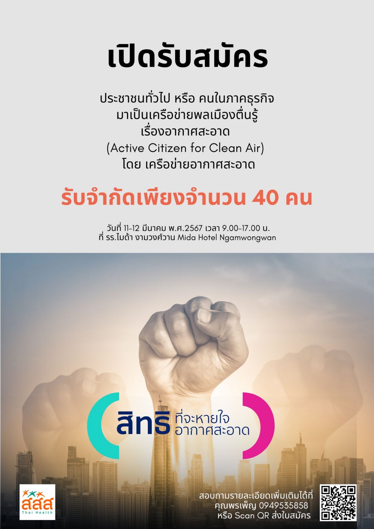 เครือข่ายอากาศสะอาดเปิดรับสมัครผู้สนใจเข้าร่วมอบรม ขอเชิญชวนประชาชน โดยเฉพาะที่อยู่ในภาคธุรกิจ ไม่ว่าจะเป็นเจ้าของกิจการ หรือผู้ที่ทำงานในส่วนต่างๆ ในธุรกิจที่สนใจประเด็น PM2.5 มาเป็นเครือข่ายพลเมืองตื่นรู้เรื่องอากาศสะอาด (Active Citizen for Clean Air) เพื่อให้เกิดความเข้าใจปัญหาและผลกระทบจากฝุ่น PM2.5 อย่างเป็นระบบ และนำไปสู่การสร้างสรรค์แนวทางการจัดการอากาศสะอาดเพื่อสุขภาพของทุกคนได้อย่างบูรณาการ