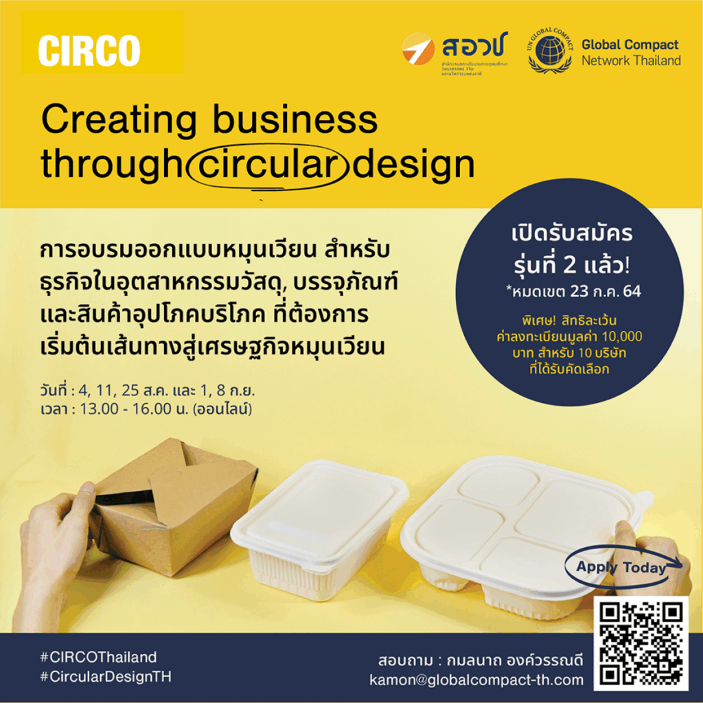 สมาคมเครือข่ายโกลบอลคอมแพ็กแห่งประเทศไทย เปิดรับสมัครบริษัทที่สนใจเข้าร่วมกิจกรรมการอบรมออกแบบหมุนเวียน (Circular Business Design Track) รุ่นที่ 2 ด้วยหลักสูตร CIRCO จากประเทศเนเธอร์แลนด์ ซึ่งเป็นส่วนหนึ่งของโครงการศึกษากระบวนการออกแบบหมุนเวียนเพื่อขับเคลื่อนเศรษฐกิจหมุนเวียน (Circular Economy) ภายใต้บันทึกข้อตกลงความร่วมมือ โครงการการพัฒนานโยบายเพื่อสร้างขีดความสามารถด้านเศรษฐกิจหมุนเวียน ระหว่าง สำนักงานสภานโยบายการอุดมศึกษา วิทยาศาสตร์ วิจัยและนวัตกรรมแห่งชาติ (สอวช.) กับ สมาคมเครือข่ายโกลบอลคอมแพ็กแห่งประเทศไทย โดยจะจัดกิจกรรมฝึกอบรมด้านการออกแบบหมุนเวียนใน 10 เส้นทางธุรกิจ ภายในระยะเวลา 18 เดือน