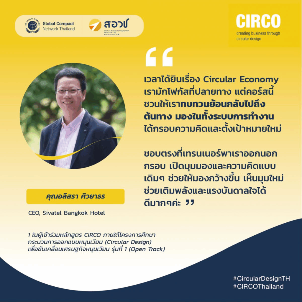 หลักสูตรการออกแบบ CIRCO คือโปรแกรมการออกแบบหมุนเวียนที่สนับสนุน ผู้ประกอบการเปลี่ยนแปลงการทำธุรกิจแบบเดิมไปสู่เศรษฐกิจหมุนเวียน โดยหลักสูตรนี้จะแสดงให้เห็นถึง โอกาสของรูปแบบธุรกิจเศรษฐกิจหมุนเวียนตลอดห่วงโซ่อุปทาน (Business Model), รูปแบบการผลิต การบริการที่ เป็นเศรษฐกิจหมุนเวียน ผ่านกระบวนการ design thinking , business model design และ supply chain analysis โดยพัฒนามาจากกรอบความคิด  “Products that Last” ซึ่งประกอบไปด้วยโมเดลธุรกิจหมุนเวียน และกลยุทธ์การออกแบบหมุนเวียนที่ถูกวิจัยและพัฒนาขึ้นโดยมหาวิทยาลัย Technical University of Delft (TU Delft) ที่ประเทศเนเธอร์แลนด์ ให้เป็นขั้นตอนการออกแบบที่เป็นรูปธรรมเพื่อให้ธุรกิจสามารถนำไปประยุกต์ใช้ในการสร้างนวัตกรรมได้อย่างแท้จริง