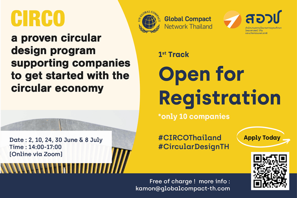 สมาคมเครือข่ายโกลบอลคอมแพ็กแห่งประเทศไทย เปิดรับสมัคร 10 บริษัทที่สนใจเข้าร่วมกิจกรรมการอบรมออกแบบหมุนเวียน (Circular Business Design Track) ในกลุ่มรุ่นแรก (ครั้งที่ 1) กับวิทยากรจาก CIRCO ประเทศเนเธอร์แลนด์ ซึ่งเป็นส่วนหนึ่งของโครงการศึกษากระบวนการออกแบบหมุนเวียนเพื่อขับเคลื่อนเศรษฐกิจหมุนเวียน (Circular Economy) ภายใต้บันทึกข้อตกลงความร่วมมือ โครงการการพัฒนานโยบายเพื่อสร้างขีดความสามารถด้านเศรษฐกิจหมุนเวียน ระหว่าง สำนักงานสภานโยบายการอุดมศึกษา วิทยาศาสตร์ วิจัยและนวัตกรรมแห่งชาติ (สอวช.) กับ สมาคมเครือข่ายโกลบอลคอมแพ็กแห่งประเทศไทย โดยจะจัดกิจกรรมฝึกอบรมด้านการออกแบบหมุนเวียนใน 10 เส้นทางธุรกิจ ภายในระยะเวลา 18 เดือน