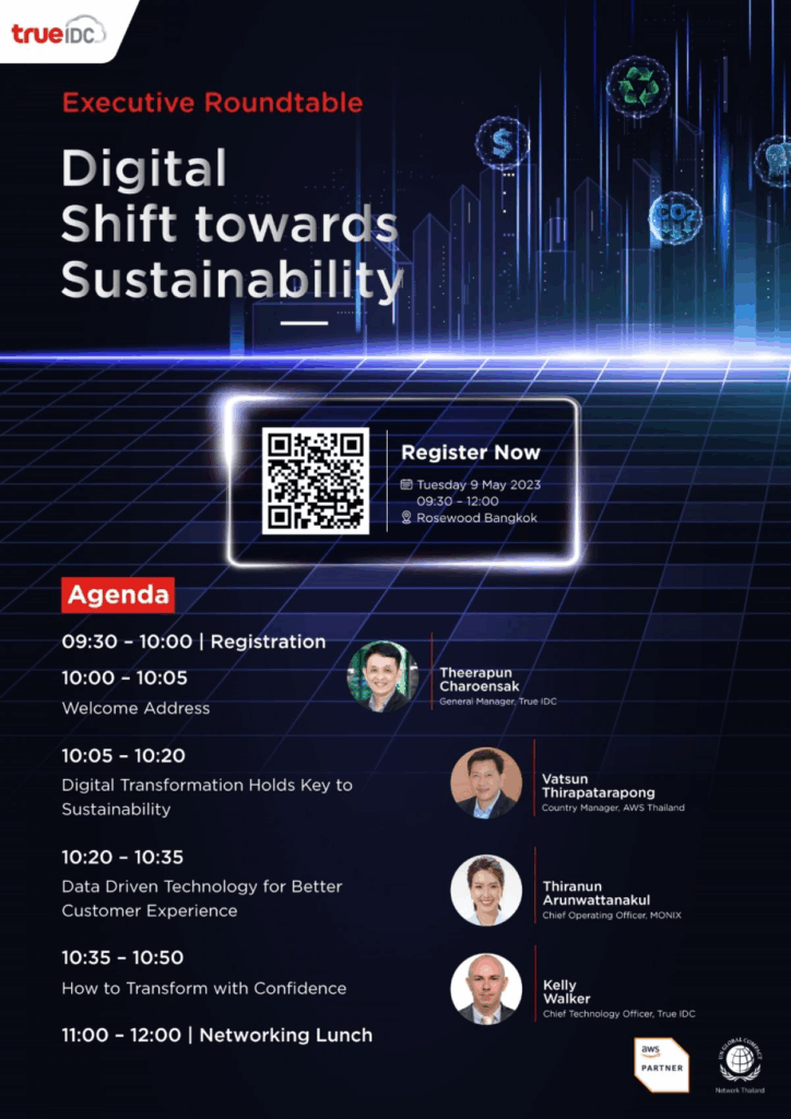 True IDC ขอเชิญร่วมงาน Executive Roundtable: Digital Shift towards Sustainability เพื่อนำเสนอแนวคิดที่ส่งเสริมให้ธุรกิจสามารถนำเอาเทคโนโลยีและความเชี่ยวชาญด้านไอทีไปสนับสนุนการทำ Digital Transformation ขององค์กรให้ไปสู่ก้าวที่ไกลกว่าและยั่งยืนกว่า ตลอดจนร่วมแลกเปลี่ยนไอเดีย ความคิดเห็น และประสบการณ์จากผู้บริหารระดับสูงจากองค์กรชั้นนำของไทยจากหลากหลายอุตสาหกรรม