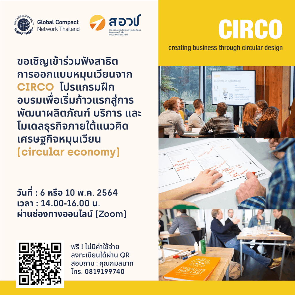 สมาคมเครือข่ายโกลบอลคอมแพ็กแห่งประเทศไทย ขอเชิญนักพัฒนาผลิตภัณฑ์ นักพัฒนาธุรกิจ ทีมกลยุทธ์ธุรกิจ และผู้ที่สนใจเข้าร่วมการสัมมนาเชิงปฏิบัติการ ‘CIRCO DEMO Workshop’ กับวิทยากรจาก CIRCO ประเทศเนเธอร์แลนด์ ที่จะมาแนะนำเครื่องมือการออกแบบหมุนเวียน (Circular Design methodology) ภายใต้แนวคิด “Creating business through circular design” เพื่อการออกแบบผลิตภัณฑ์ บริการ โมเดลธุรกิจและนวัตกรรมในเศรษฐกิจหมุนเวียน