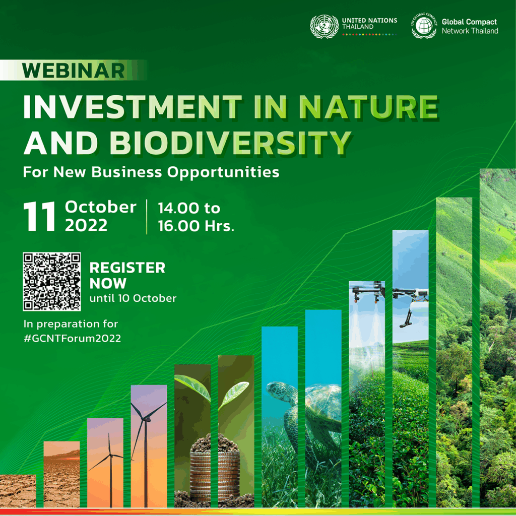 สหประชาชาติประจำประเทศไทย (UN in Thailand) ร่วมกับสมาคมเครือข่ายโกลบอลคอมแพ็กแห่งประเทศไทย (GCNT : Global Compact Network Thailand) ขอเชิญร่วมสัมมนาออนไลน์ (Webinar) หัวข้อ “Investment in Nature and Biodiversity for New Business Opportunities” ในวันอังคารที่ 11 ตุลาคม 2565 เวลา 14.00 – 16.00 น. ผ่านช่องทางออนไลน์ (Zoom Webinar)