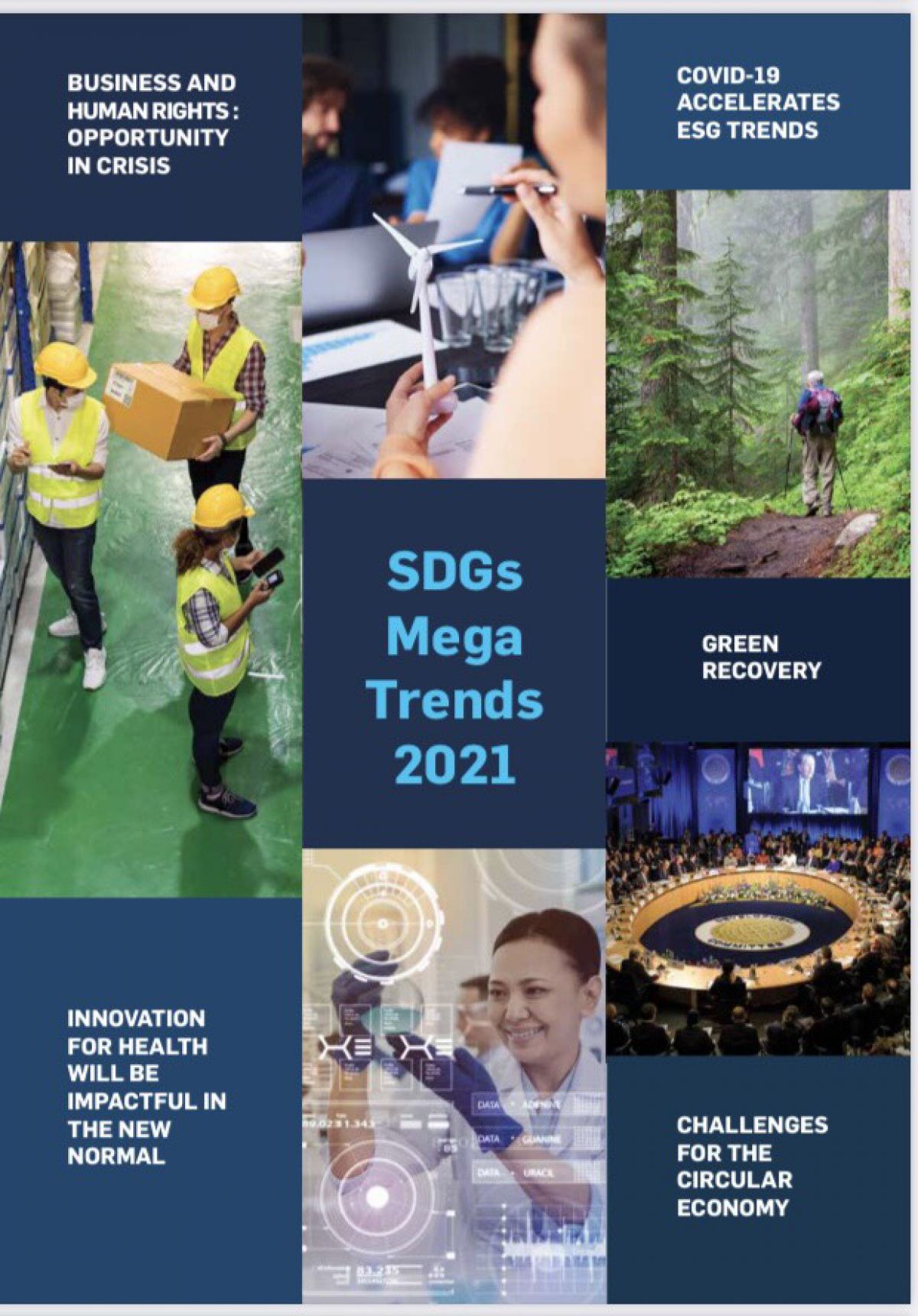 นอกจากข้อมูล 5 SDGs Mega Trends 2021 รายงานปีนี้ ยังได้นำเสนอตัวอย่างวิถีคิดของผู้นำและแนวปฏิบัติเพื่อการพัฒนาที่ยั่งยืนขององค์กรธุรกิจชั้นนำ ซึ่งเป็นสมาชิกของสมาคมเครือข่ายโกลบอลคอมแพ็กแห่งประเทศไทยที่เป็นกำลังสำคัญในการขับเคลื่อนการพัฒนาที่ยั่งยืนของประเทศไทยและของโลก ได้แก่ “เอสซีจี” (SCG) กับการขับเคลื่อนเศรษฐกิจหมุนเวียน การลงทุนอย่างรับผิดชอบเพื่อตอบโจทย์ความยั่งยืนของ “บ้านปู” (BANPU) “เครือเจริญโภคภัณฑ์” (CPG) กับการตั้งเป้าหมาย Zero Carbon Footprint และ Zero Waste การร่วมมือกับพันธมิตรขยายผลเศรษฐกิจหมุนเวียน ด้วยแนวคิด “มีทางออกให้กับทุกคน” ของ “จีซี” (GC) และวิสัยทัศน์ “อาหารแห่งอนาคต” Plant-based food ของ“เอ็นอาร์เอฟ” (NRF) รวมทั้งทิศทางการส่งเสริมการดำเนินธุรกิจอย่างยั่งยืนของสำนักงานคณะกรรมการกำกับหลักทรัพย์และตลาดหลักทรัพย์ (ก.ล.ต.)