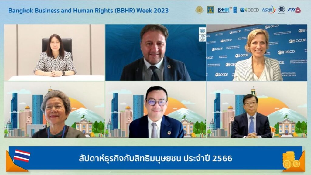 ในงานดังกล่าว มีการบรรยาย หัวข้อ “ความสำคัญของการดำเนินธุรกิจที่มีความรับผิดชอบ และเคารพสิทธิมนุษยชน : ผลกระทบต่อสิ่งแวดล้อมและการเปลี่ยนแปลงสภาพภูมิอากาศ” โดยผู้แทนจากสำนักงานข้าหลวงใหญ่สิทธิมนุษยชนแห่งสหประชาชาติ ซึ่งได้เน้นย้ำว่าสิทธิด้านสิ่งแวดล้อมถือเป็นสิทธิมนุษยชน เพราะทุกคนต้องได้เข้าถึงสิ่งแวดล้อมที่สะอาด และได้หยิบยกรายงานของ IPCC ปี 2022 ที่ยืนยันว่าการกระทำของมนุษย์ส่งผลต่อสภาพอากาศของโลก จึงจำเป็นที่ทุกภาคส่วนต้องมีแผนรับมือในเรื่องนี้ โดยเฉพาะภาคธุรกิจ จะได้รับผลกระทบทั้งทางกายภาพ (Physical Risks) เช่น ภัยแล้ง น้ำท่วม และผลกระทบจากการเปลี่ยนผ่าน (Transition Risk) เช่น กฎหมาย ข้อบังคับ หรือข้อตกลงร่วมกัน โดยบทบาทของภาคธุรกิจ ควรไปไกลกว่าการดำเนินงานตามกฎหมาย (legal compliance) รวมทั้งควรมีกระบวนการตรวจสอบสิทธิมนุษยชนรอบด้านและมีนโยบายในระดับธุรกิจของตนเอง