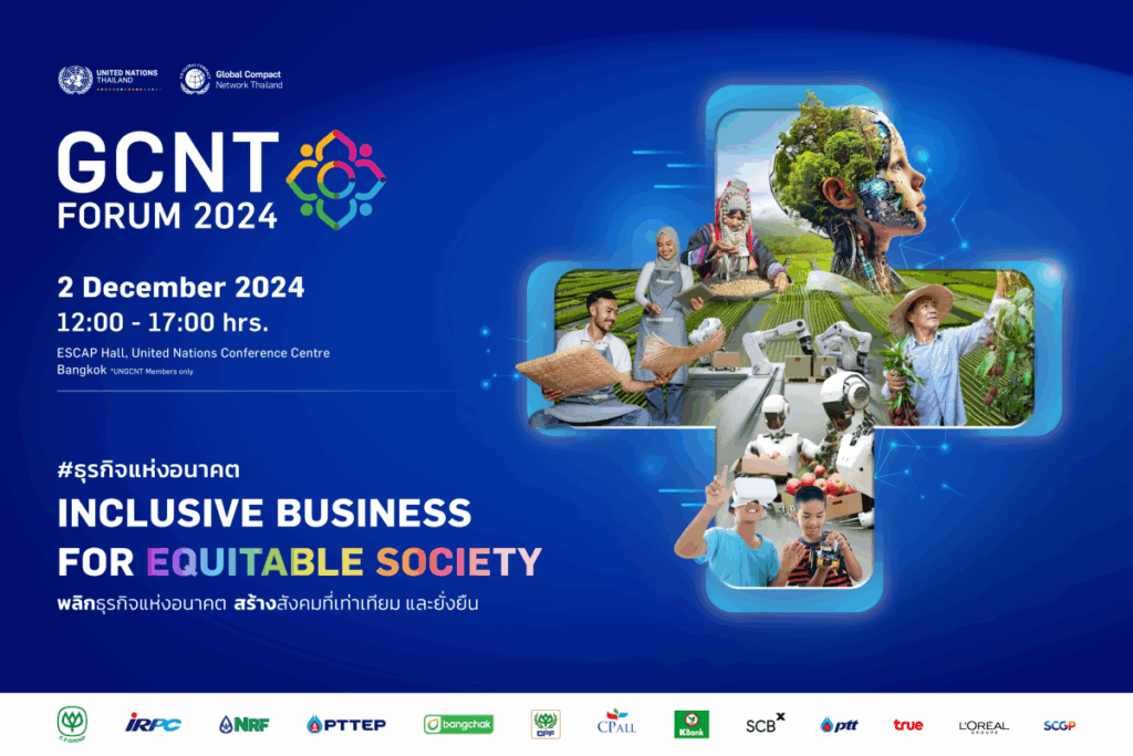 สมาคมเครือข่ายโกลบอลคอมแพ็กแห่งประเทศไทย (UNGCNT : UN Global Compact Network Thailand) ร่วมกับสหประชาชาติในประเทศไทย (UN in Thailand) ผนึกพลังสมาชิกเตรียมจัดประชุมผู้นำความยั่งยืนประจำปี GCNT Forum 2024 ชู Inclusive Business โมเดลธุรกิจแห่งอนาคต สร้างกำไรอย่างยั่งยืน กระตุ้นเศรษฐกิจท้องถิ่น สร้างสังคมที่เท่าเทียม