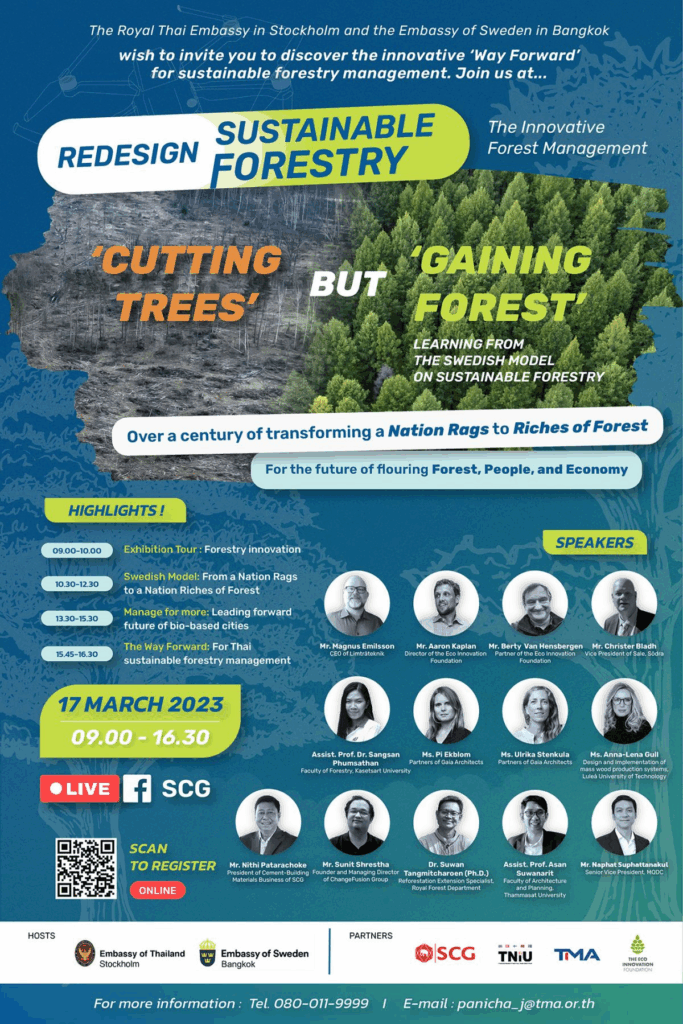 สถานเอกอัครราชทูต ณ กรุงสตอกโฮล์ม สถานเอกอัครราชทูตสวีเดนประจำประเทศไทย TMA และ เอสซีจี ขอเรียนเชิญท่านเข้าร่วมงาน Redesign Sustainable Forestry :The Innovative Forest Management