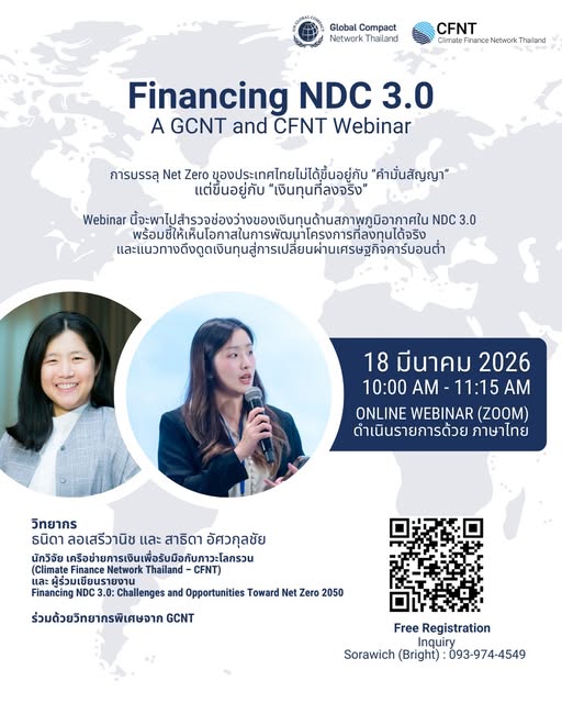 Webinar นี้จะพาสำรวจช่องว่างของเงินทุนด้านสภาพภูมิอากาศใน NDC 3.0 พร้อมชี้ให้เห็นโอกาสจริงในการพัฒนาโครงการที่ bankable ดึงทุนเอกชน ลดความเสี่ยง และทำให้การลงทุนของภาคธุรกิจเดินไปทิศเดียวกับอนาคตคาร์บอนต่ำ