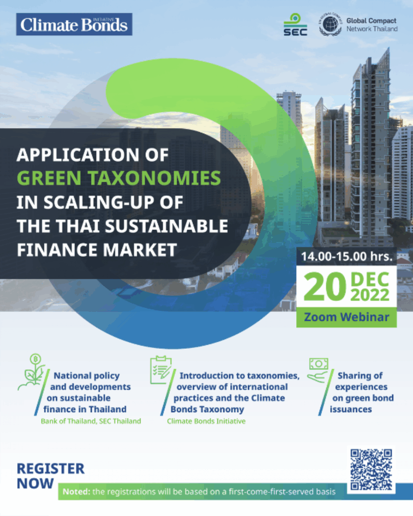 UN Global Compact Network Thailand in collaboration with Securities and Exchange Commission, Thailand, and Climate Bonds Initiative would like to invite you to the webinar serie for Thai investors and publicly listed companies on 20 December 2022, 2.00pm – 3.00pm (Bangkok time, GMT+7)