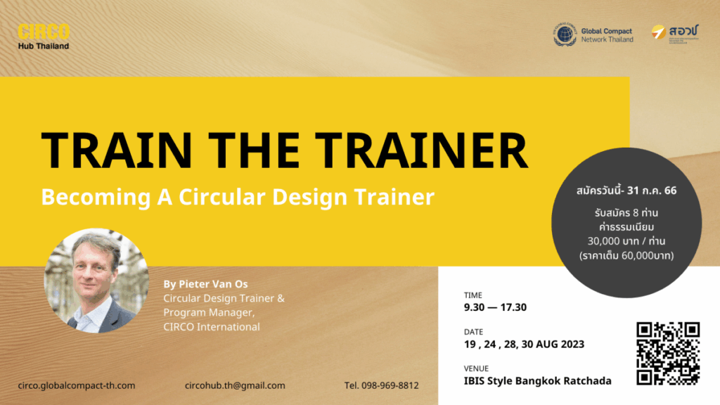 ขอเชิญชวน วิทยากร ที่ปรึกษา นักพัฒนาธุรกิจ และผู้ที่สนใจ มาอบรมเป็นเทรนเนอร์หลักสูตร  CIRCO Creating Business Through Circular Design  กระบวนการช่วยธุรกิจออกแบบนวัตกรรมทางอย่างเป็นขั้นตอน เพิ่มมูลค่า สร้างความสัมพันธ์กับลูกค้า และโอกาสทางการแข่งขันอย่างยั่งยืน
