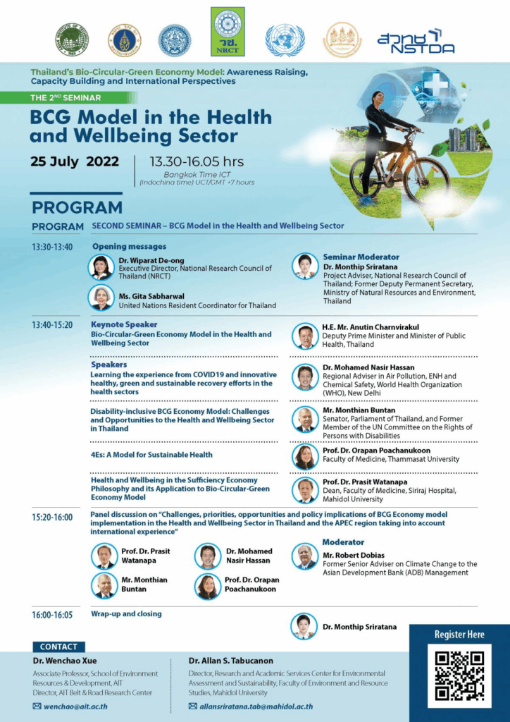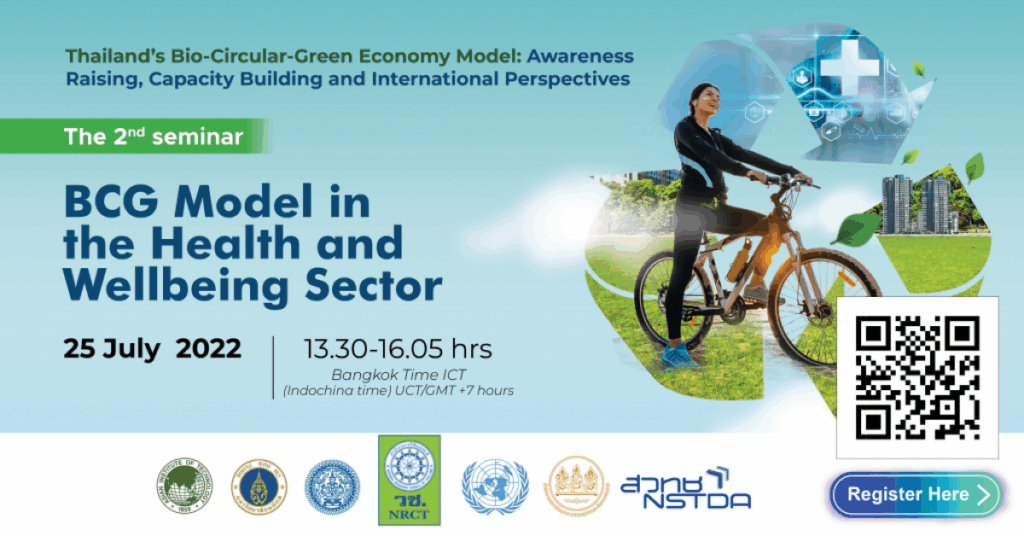 We are pleased to invite you to the second seminar on Thailand’s Bio-Circular-Green Economy Model: Awareness Raising, Capacity Building and International Perspective. This seminar will focus on the ‘Health and Wellbeing Sector’ and will be held on Monday, 25 July 2022, 13:30 to 16:05 hrs Bangkok Time GMT+7 (Virtual). The speakers will introduce the BCG model and broadly describe how it is being applied.