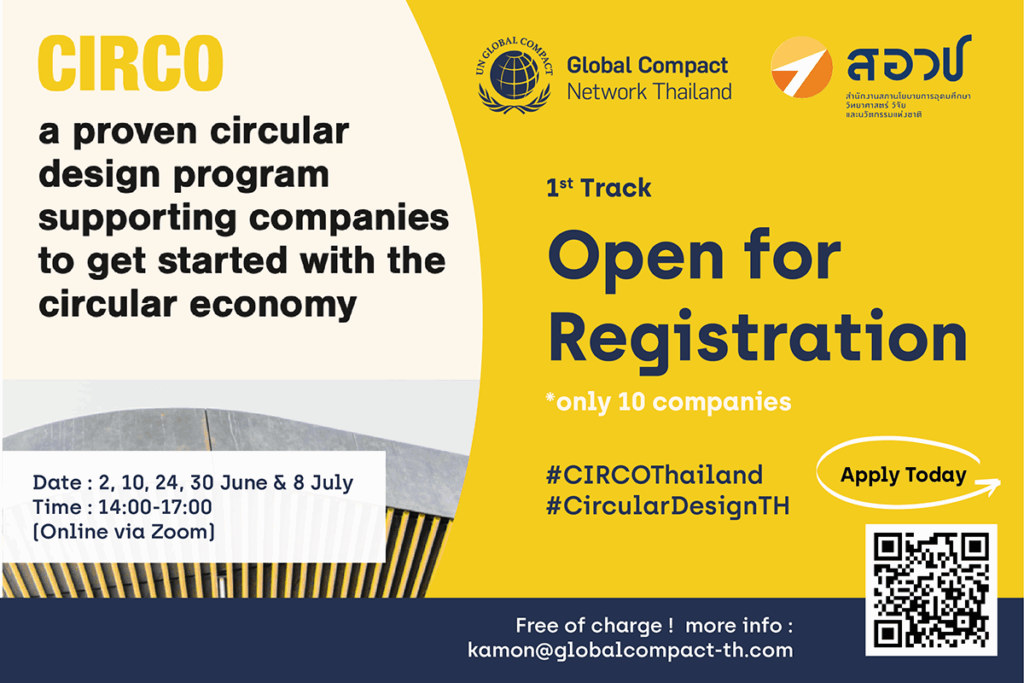 นางสาวธันยพร กริชทายาวุธ ผู้อำนวยการสมาคมเครือข่ายโกลบอลคอมแพ็กแห่งประเทศไทย เปิดเผยว่าสมาคมฯ ได้ร่วมมือกับ สอวช. ดำเนินโครงการสร้างขีดความสามารถด้านการออกแบบหมุนเวียน (Circular Design) เพื่อสร้างความร่วมมือของภาคเอกชนในการเปลี่ยนผ่านธุรกิจสู่ระบบเศรษฐกิจหมุนเวียน โดยใช้องค์ความรู้จาก CIRCO ด้วยการสนับสนุนของสถานทูตเนเธอร์แลนด์ จัดการอบรมให้กับผู้นำอบรม (Trainer) ออกแบบหมุนเวียน (Circular Design) จำนวน 100 องค์กร ใน 10 เส้นทางธุรกิจ (Track) อาทิ อาหาร ก่อสร้าง พลาสติก ยานยนต์ ชุมชน ฯลฯ โดย ซึ่งเป็นการสนับสนุนการดำเนินธุรกิจให้สอดคล้องการพัฒนาที่ยั่งยืน ตามพันธกิจของสมาคมฯ ควบคู่กับการนำเทคโนโลยีมาประยุกต์ใช้ตลอดกระบวนการพัฒนาผลิตภัณฑ์ โดยส่งเสริมการปรับวิธีคิด ปรับการออกแบบให้เป็นรูปแบบธุรกิจใหม่ (new business model) ด้วยแนวคิดเศรษฐกิจหมุนเวียน หวังว่าผู้ประกอบการจะได้เห็นโอกาสสำหรับธุรกิจ ก่อให้เกิดระบบเศรษฐกิจหมุนเวียนที่ก่อมูลค่าทางเศรษฐกิจและตอบโจทย์การพัฒนาที่ยั่งยืน