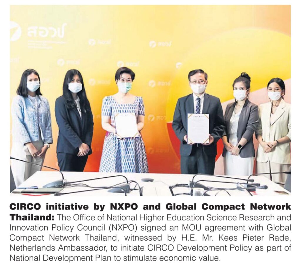 พฤษภาคม 2564 : สมาคมเครือข่ายโกลบอลคอมแพ็กแห่งประเทศไทย หรือ GCNT (Global Compact Network Thailand) เครือข่ายความยั่งยืนที่ใหญ่ที่สุดในประเทศไทย ร่วมกับ สำนักงานสภานโยบายการอุดมศึกษา วิทยาศาสตร์ วิจัย และนวัตกรรมแห่งชาติ (สอวช.) เชิญชวนภาคเอกชนร่วมขับเคลื่อนเศรษกิจหมุนเวียน (Circular Economy) ตั้งเป้า 100 องค์กรใน 10 เส้นทางธุรกิจ เข้าร่วมกิจกรรมการออกแบบหมุนเวียน (Circular Design) ภายใต้โครงการการพัฒนานโยบายเพื่อสร้างขีดความสามารถด้านเศรษฐกิจหมุนเวียน