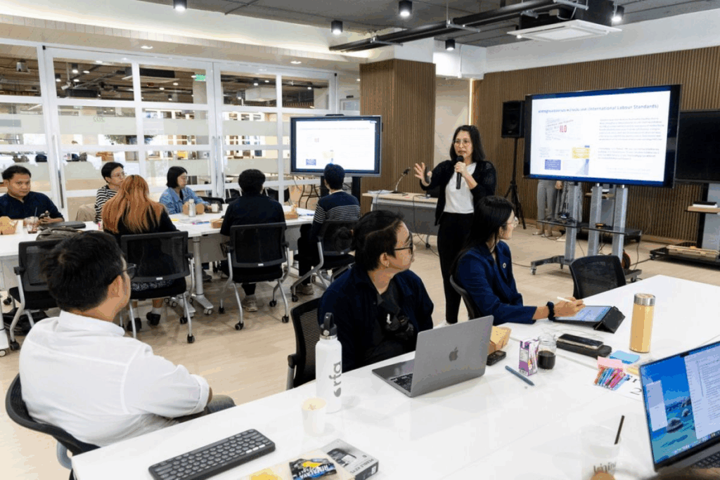 ทั้งนี้ คุณขวัญฤทัย ศิริพัฒนโกศล รองเลขาธิการสมาคมเครือข่ายโกลบอลคอมแพ็กแห่งประเทศไทย (GCNT) ร่วมบรรยายในประเด็นด้านสิทธิแรงงาน ได้แก่ ความท้าทายด้านสิทธิแรงงานในบริบทของประเทศไทย และกรณีศึกษาจริง: การเอารัดเอาเปรียบด้านค่าจ้าง ความไม่ปลอดภัยในการทำงาน และแรงงานข้ามชาติ ตลอดทั้งนำกิจกรรมกลุ่ม ในหัวข้อ การจัดกลุ่มประเด็นสิทธิแรงงานในอุตสาหกรรมต่าง ๆ เช่น อุตสาหกรรมประมง การผลิต และลักษณะของระบบเศรษฐกิจแบบตลาดแรงงานเสรี (Gig Economy)