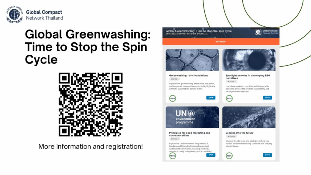 ผู้ที่สนใจเรียนรู้เรื่อง Greenwashing สามารถอ่านรายละเอียดและลงทะเบียนเรียนในคอร์สออนไลน์ Global Greenwashing: Time to stop the spin cycle ได้ในลิงก์นี้ https://unglobalcompact.org.au/sustainability-governance/international-greenwashing-course/