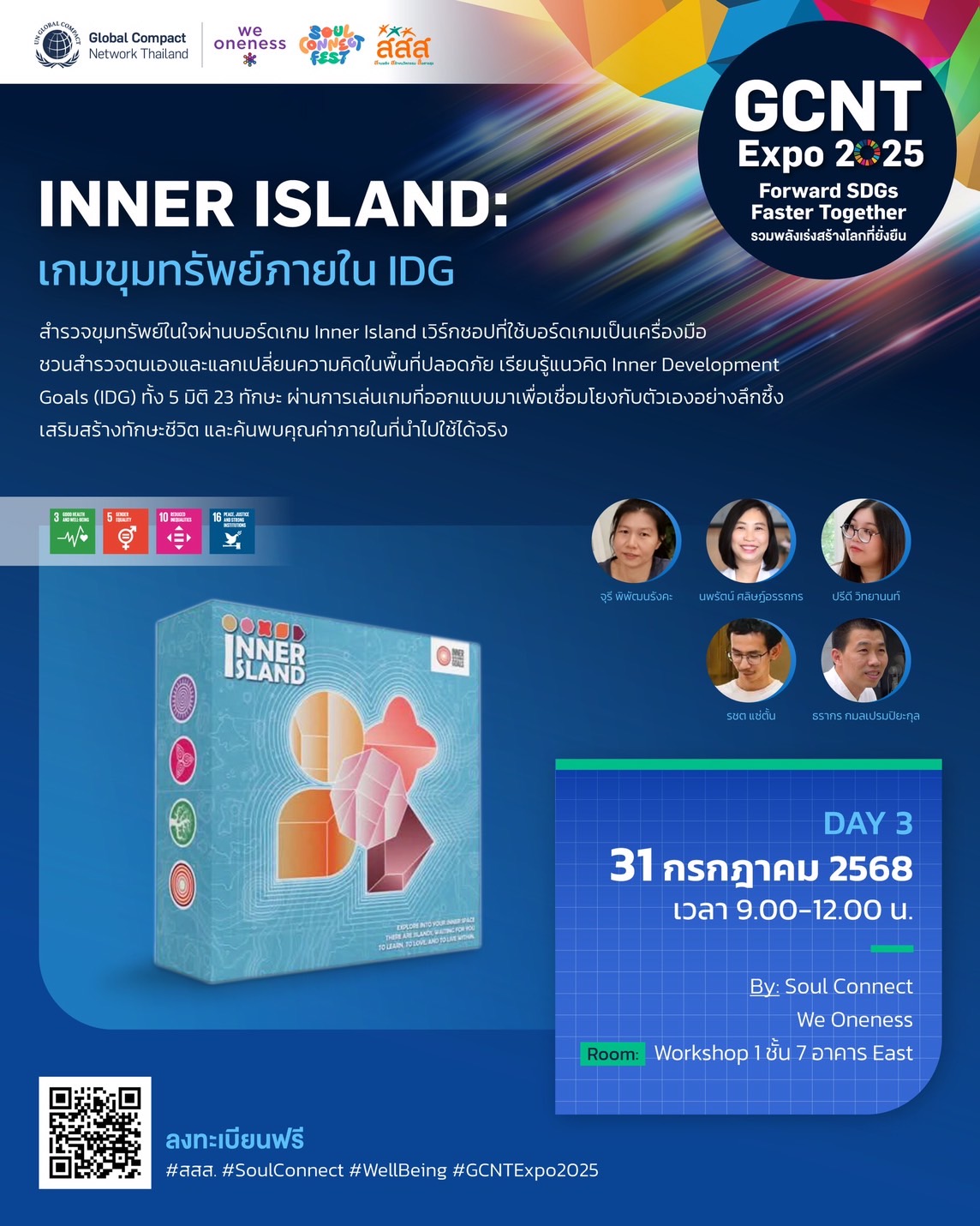 เวิร์กชอปที่ใช้บอร์ดเกมเป็นเครื่องมือชวนสำรวจตนเองและแลกเปลี่ยนความคิดในพื้นที่ปลอดภัย เรียนรู้แนวคิด Inner Development Goals (IDG) ทั้ง 5 มิติ 23 ทักษะ ผ่านการเล่นเกมที่ออกแบบมาเพื่อเชื่อมโยงกับตัวเองอย่างลึกซึ้ง เสริมสร้างทักษะชีวิต และค้นพบคุณค่าภายในที่นำไปใช้ได้จริง