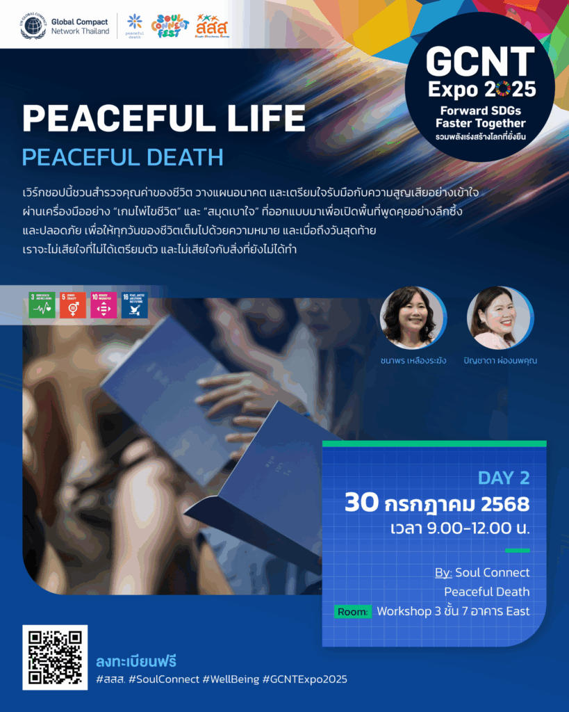 เพราะชีวิตไม่แน่นอน แต่ทุกคนสามารถเลือกใช้มันอย่างมีความหมายได้ เวิร์กชอปนี้ชวนสำรวจคุณค่าของชีวิต วางแผนอนาคต และเตรียมใจรับมือกับความสูญเสียอย่างเข้าใจ ผ่านเครื่องมืออย่าง “เกมไพ่ไขชีวิต” และ “สมุดเบาใจ” ที่ออกแบบมาเพื่อเปิดพื้นที่พูดคุยอย่างลึกซึ้งและปลอดภัย เพื่อให้ทุกวันของชีวิตเต็มไปด้วยความหมาย และเมื่อถึงวันสุดท้าย เราจะไม่เสียใจที่ไม่ได้เตรียมตัว และไม่เสียใจกับสิ่งที่ยังไม่ได้ทำ