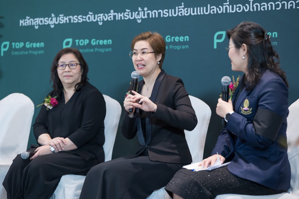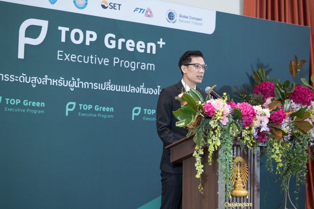 ดร.พิรุณ สัยยะสิทธิ์พานิช อธิบดีกรมการเปลี่ยนแปลงสภาพภูมิอากาศและสิ่งแวดล้อม ได้ปาฐกถาพิเศษ ว่า สะท้อนให้เห็นถึงความเสี่ยงด้านสิ่งแวดล้อมในมิติเศรษฐกิจและความต่อเนื่องทางธุรกิจว่า ความผันผวนของสภาพภูมิอากาศ ปัญหาทรัพยากรน้ำ มลพิษ และแรงกดดันด้านกฎระเบียบ กำลังกลายเป็น “ต้นทุนแฝง” ที่ส่งผลต่อการดำเนินงานจริงของภาคธุรกิจมากขึ้น พร้อมส่งสัญญาณให้ภาคเอกชนเร่งยกระดับการบริหารความเสี่ยงอย่างเป็นระบบ และผลักดันแนวคิด Research to Commercial เพื่อขยายการนำองค์ความรู้และนวัตกรรมไปใช้จริง โดยหลักสูตร TOP Green PLUS จะเป็นกลไกสำคัญในการเชื่อมองค์ความรู้เชิงวิชาการกับการบริหารจัดการเชิงธุรกิจให้เกิดผลลัพธ์ที่จับต้องได้