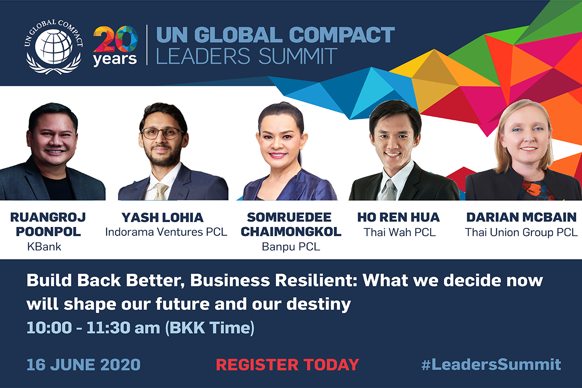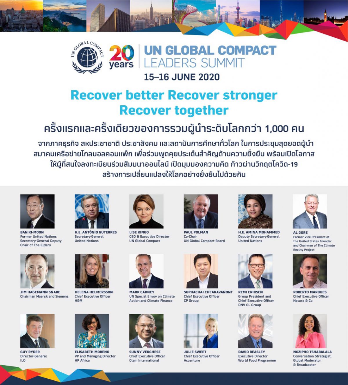 UN Global Compact หรือความร่วมมือของภาคเอกชนแห่งสหประชาชาติมุ่งสู่การพัฒนาอย่างยั่งยืน จะจัดงาน “UN Global Compact Virtual Leaders Summit 2020” งานสัมมนาด้านความยั่งยืนระดับโลกในวาระครบรอบ 20 ปี ผ่านแพลตฟอร์มออนไลน์ทั่วโลกเป็นครั้งแรก ในวันที่ 15-16 มิถุนายน 2563 พร้อมให้ผู้ที่สนใจลงทะเบียนเข้าร่วมออนไลน์ได้ทุกฟอรั่มตลอด 24 ชม.