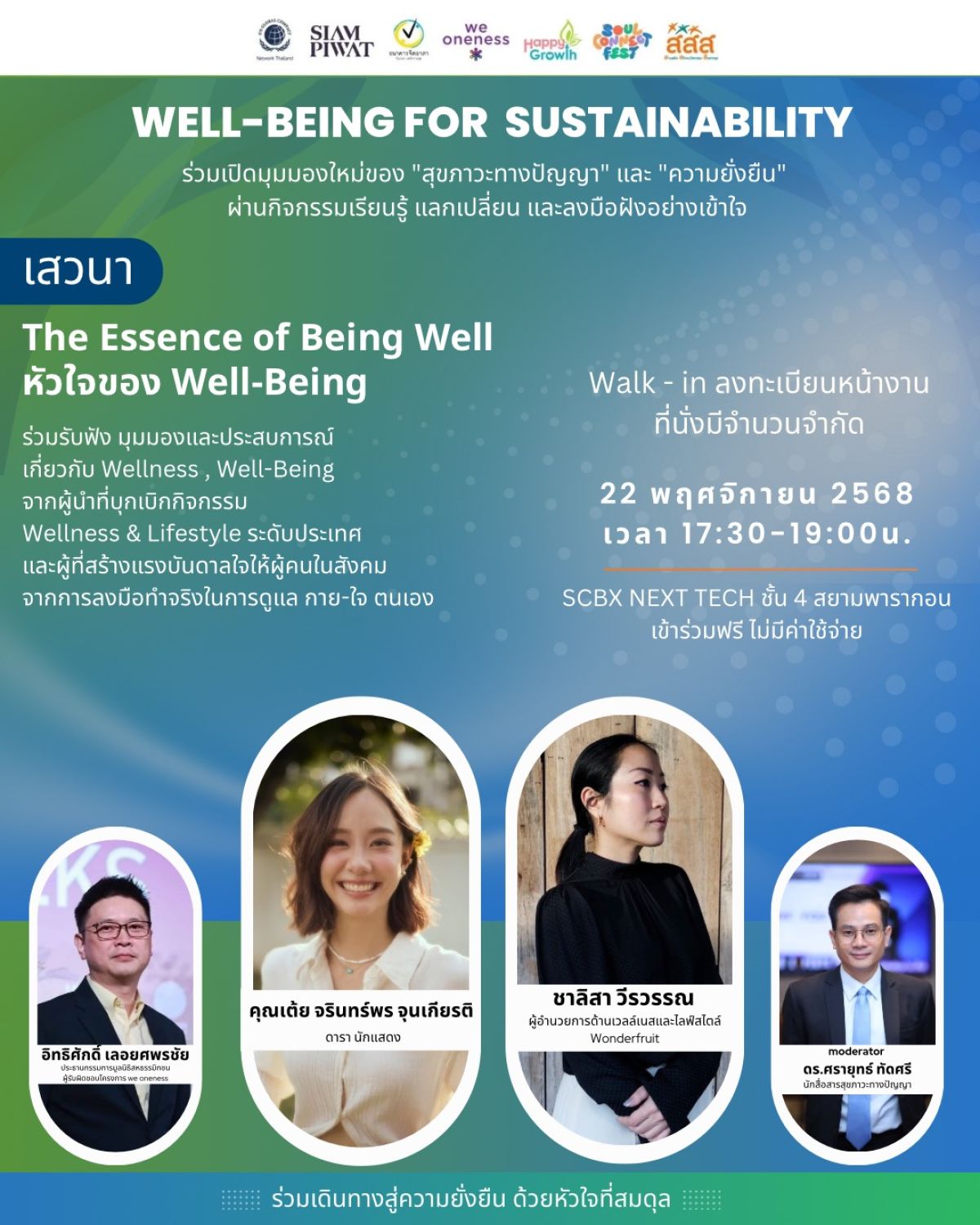 - เสวนา "The Essence of Being Well: หัวใจของ Well-Being" โดย คุณเต้ย จรินทร์พร จุนเกียรติ คุณชาลิสา วีรวรรณ คุณอิทธิศักดิ์ เลอยศพรชัย ดำเนินรายการ โดย ดร.ศรายุทธ์ ทัดศรี