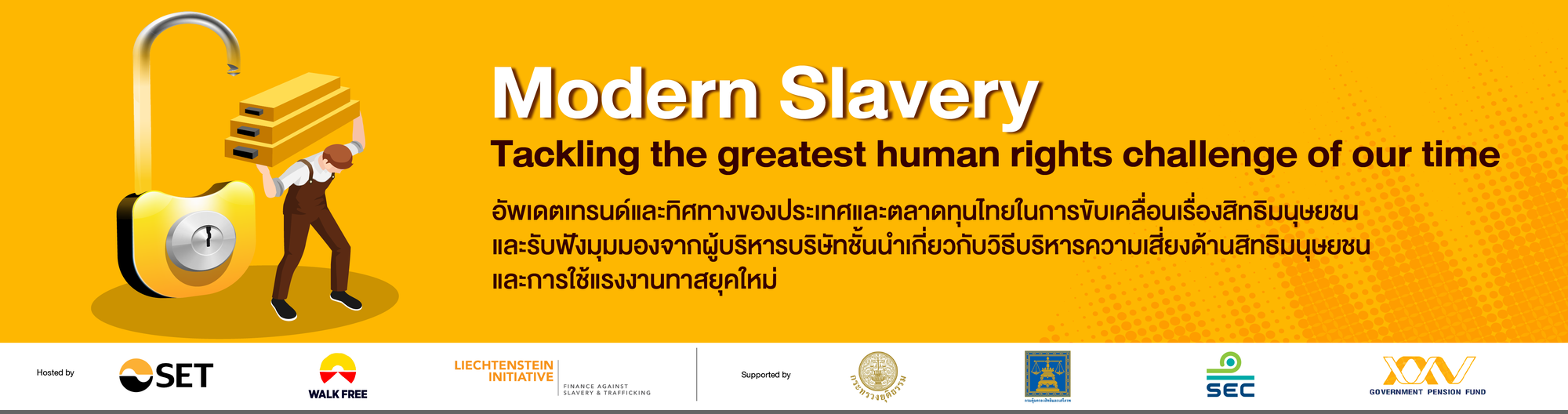 ตลาดหลักทรัพย์แห่งประเทศไทย (SET) ร่วมกับ Walk Free และ Finance Against Slavery and Trafficking (FAST) องค์กรพันธมิตรระดับสากลที่เชี่ยวชาญประเด็นสิทธิมนุษยชน จัดทำชุดเครื่องมือบริหารความเสี่ยงด้านสิทธิมนุษยชนและสิทธิแรงงาน ประกอบด้วย “คู่มือความเสี่ยงด้านการใช้แรงงานทาสยุคใหม่สำหรับธุรกิจไทย”(Guidance on Modern Slavery Risks for Thai Businesses) และ Modern Slavery Benchmarking Tool สำหรับบริษัทจดทะเบียน (บจ.) ผู้ประกอบการ และผู้สนใจ ใช้บริหารความเสี่ยงตามลักษณะของธุรกิจในแต่ละอุตสาหกรรม ช่วยลดปัญหาการละเมิดสิทธิมนุษยชน สร้างการยอมรับจากผู้มีส่วนได้เสียทุกภาคส่วน ยกระดับความเชื่อมั่นต่อธุรกิจไทยในเวทีโลก