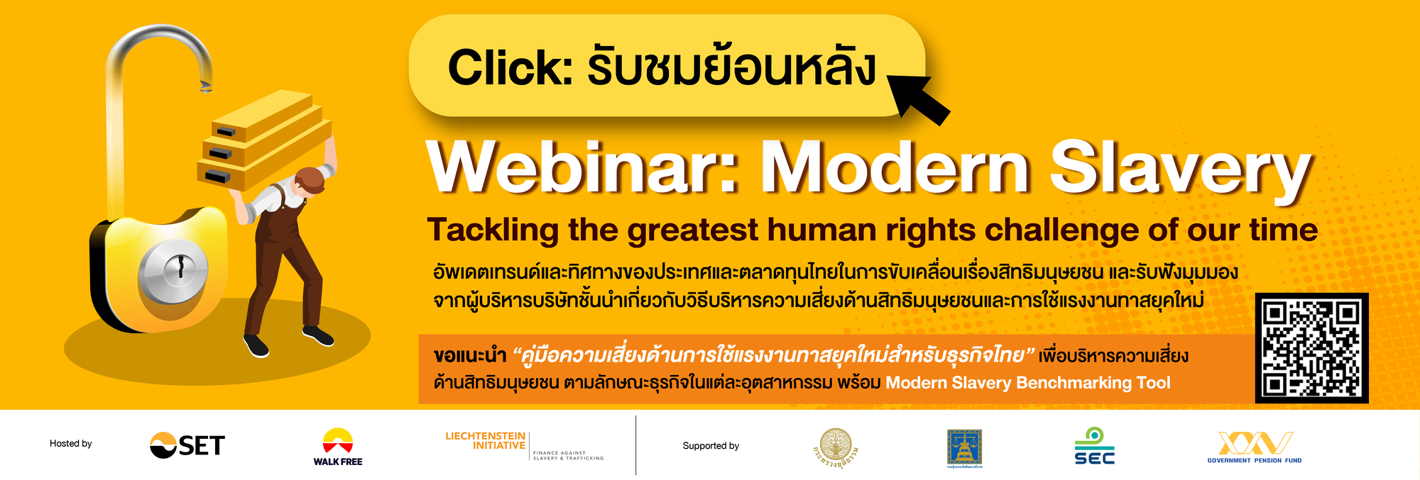 สัมมนาออนไลน์อัพเดตเทรนด์และทิศทางของประเทศและตลาดทุนไทยในการขับเคลื่อนเรื่องสิทธิมนุษยชน และรับฟังมุมมองจากผู้บริหารบริษัทชั้นนำเกี่ยวกับวิธีบริหารความเสี่ยงด้านสิทธิมนุษยชนและการใช้แรงงานทาสยุคใหม่ Click