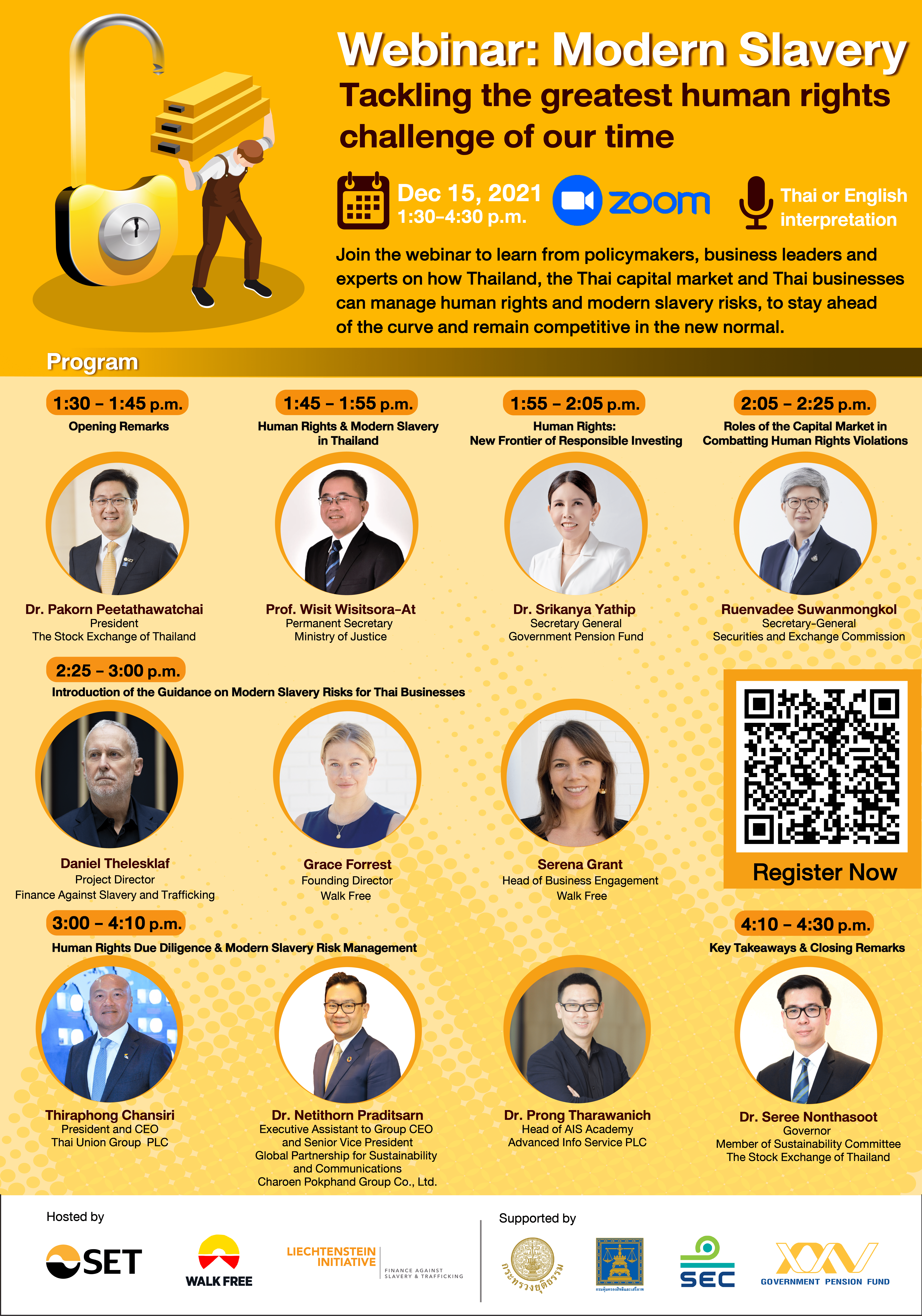 Join the webinar to learn from policymakers, business leaders and experts on how Thailand, Thai capital market and Thai businesses could manage human rights and modern slavery risks, to stay ahead of the curve and remain  competitive in the new normal. Click