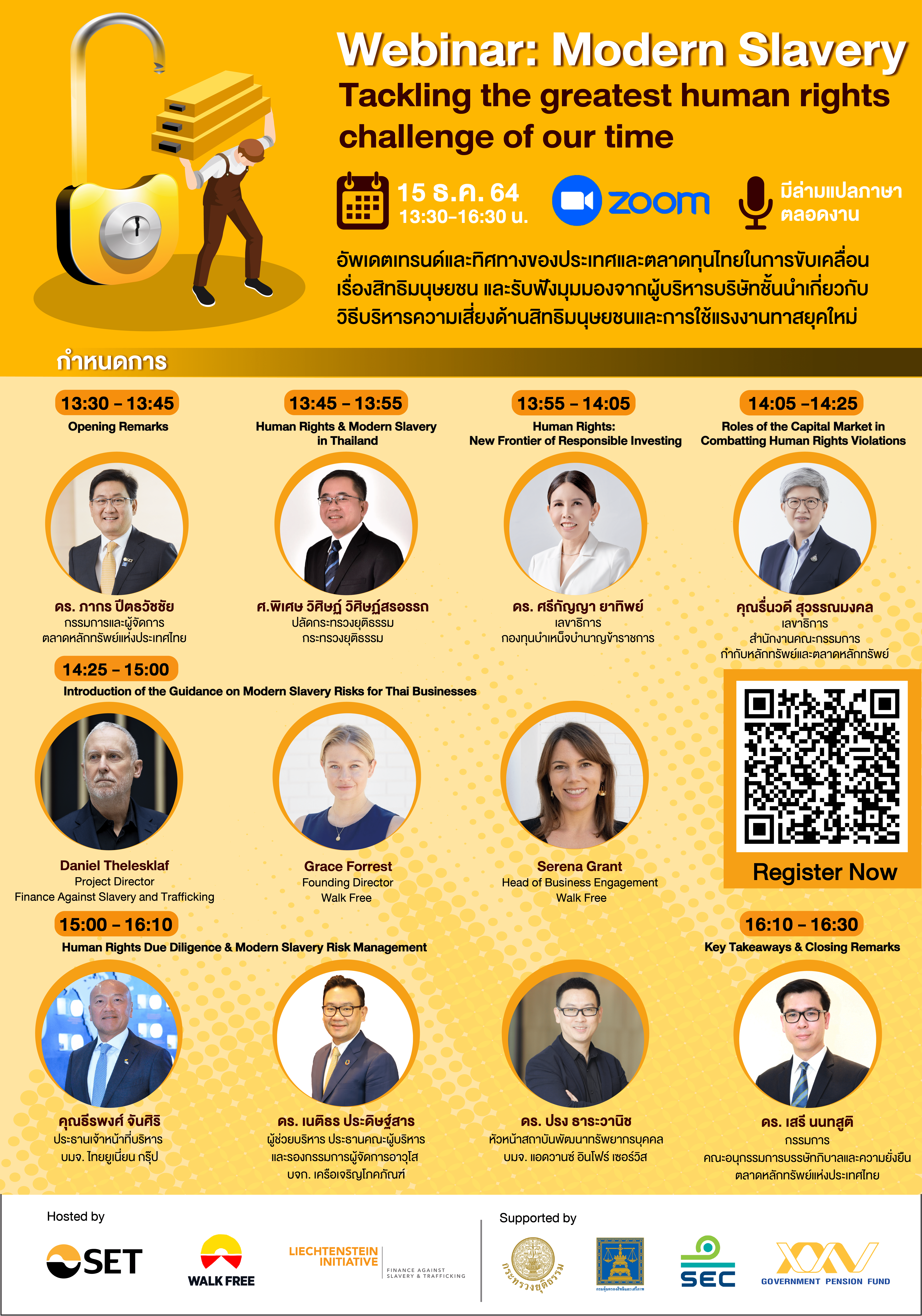 Join the webinar to learn from policymakers, business leaders and experts on how Thailand, Thai capital market and Thai businesses could manage human rights and modern slavery risks, to stay ahead of the curve and remain competitive in the new normal. Click