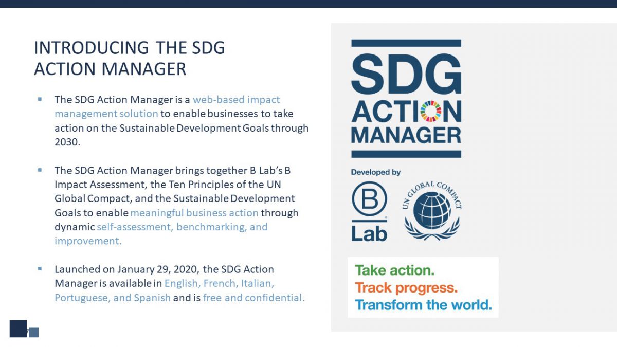 The SDG Action Manager has been informed by the work and feedback of a range of stakeholders, including experts in corporate sustainability, civil society, UN, and academia. It is inspired by the Certified B Corp community and participating companies of the UN Global Compact.